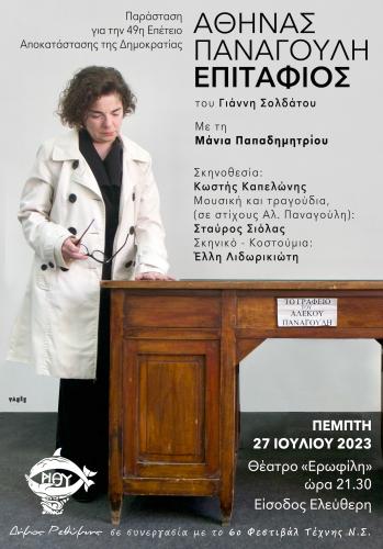 Ο Δήμος Ρεθύμνης, σε συνεργασία με το 6ο Φεστιβάλ Τέχνης Ν.Σ., παρουσιάζει τη θεατρική παραγωγή του Πολυχώρου VAULT, “Αθηνάς Παναγούλη, Επιτάφιος”.