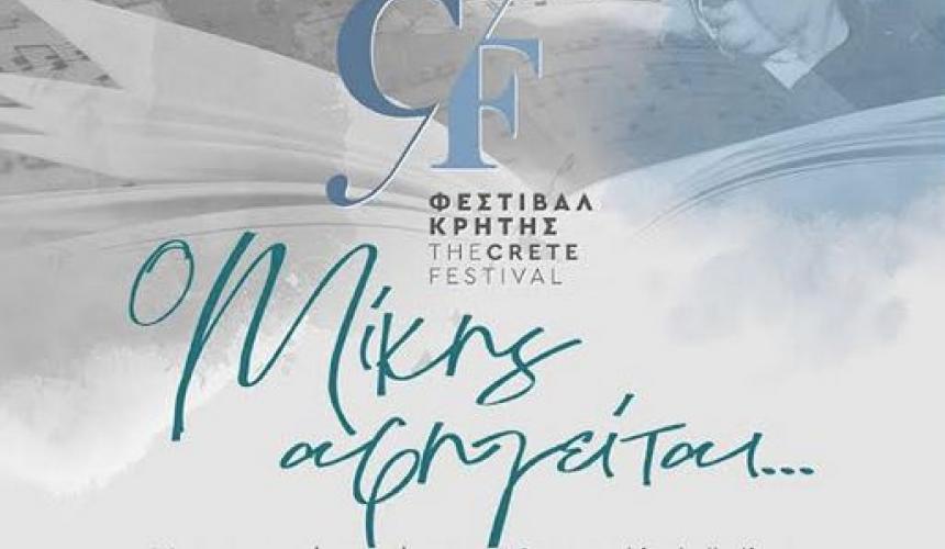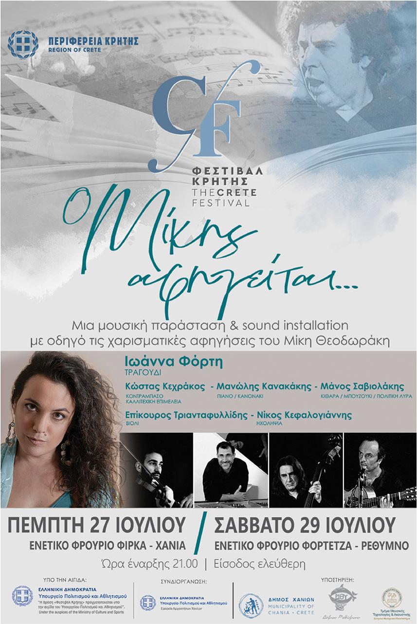 Το Φεστιβάλ Κρήτης της Περιφέρειας Κρήτης παρουσιάζει την ακουστική παράσταση «Ο Μίκης αφηγείται…» στις 27 Ιουλίου στα Χανιά - Ενετικό φρούριο Φιρκά και στις 29 Ιουλίου στο Ρέθυμνο - στο Ενετικό φρούριο Φορτέτζα. Ώρα έναρξης στις 21:00 με ελεύθερη είσοδο για τους πολίτες. Οι παραστάσεις τελούν υπό την αιγίδα του υπουργείου Πολιτισμού.