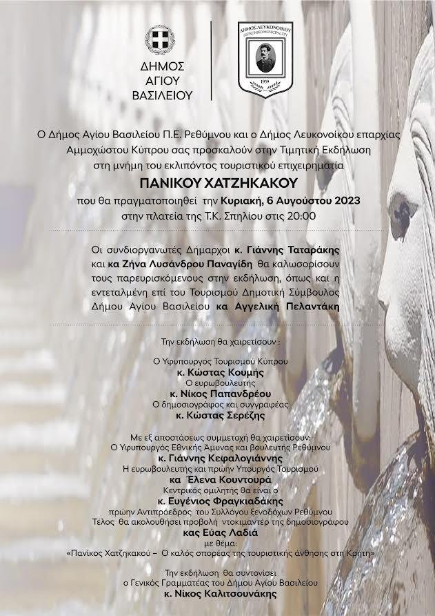 Ο Δήμος Αγίου Βασιλείου Π.Ε. Ρεθύμνου και ο Δήμος Λευκονοίκου επαρχίας Αμμοχώστου διοργανώνουν Τιμητική Εκδήλωση στη μνήμη του εκλιπόντος τουριστικού επιχειρηματία ΠΑΝΙΚΟΥ ΧΑΤΖΗΚΑΚΟΥ.