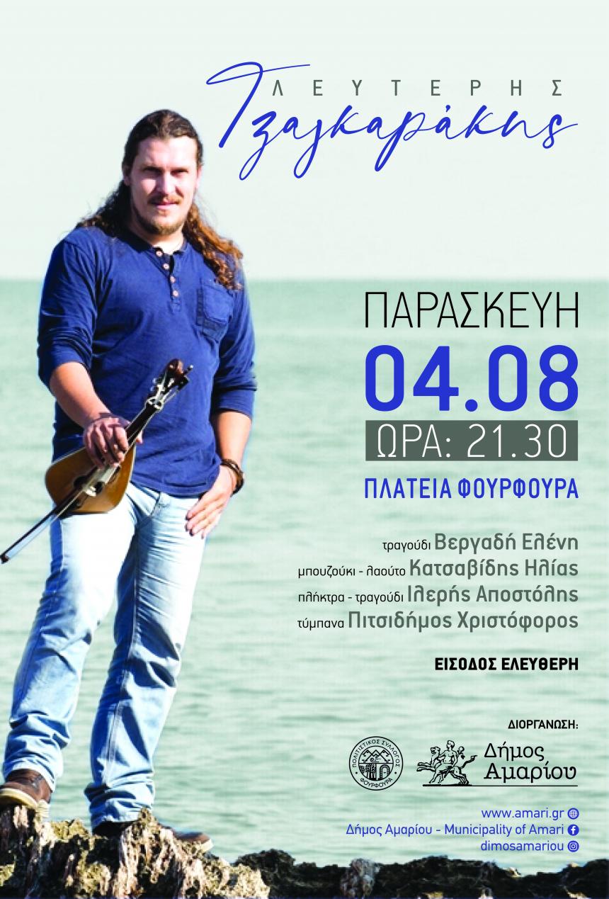 Μια όμορφη μουσική βραδιά με το σχήμα του Λευτέρη Τζαγκαράκη θα έχουν την ευκαιρία να απολαύσουν όσοι βρεθούν την Παρασκευή 4 Αυγούστου στις 21:30 στην πλατεία Φουρφουρά.