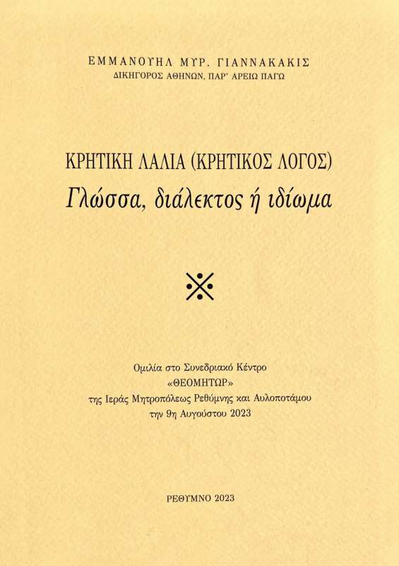 Με επιτυχία πραγματοποιήθηκε, το απόγευμα της Τετάρτης, 9ης Αυγούστου 2023, στην κεντρική αίθουσα του Κέντρου Πολιτισμικής και Κοινωνικής Διακονίας «Θεομήτωρ» της Ιεράς Μητροπόλεως Ρεθύμνης και Αυλοποτάμου, η εκδήλωση με θέμα: «ΚΡΗΤΙΚΗ ΛΑΛΙΑ (Κρητικός Λόγος) - γλώσσα, διάλεκτος ή ιδίωμα».