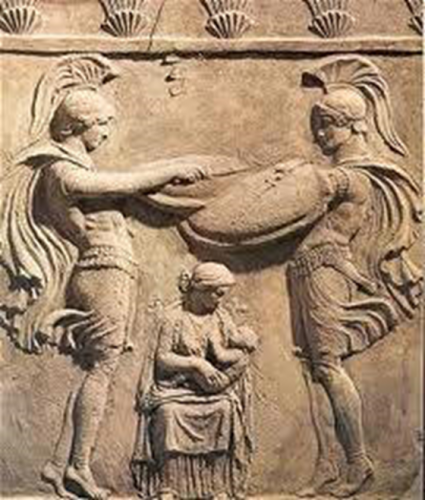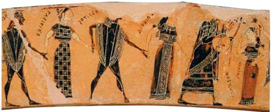 Πριν, ωστόσο, τελειώσω, επιτρέψτε μου να υπενθυμίσω την περιγραφή της ασπίδας που έφτιαξε ο Ήφαιστος για τον Αχιλλέα.Στο κέντρο της υπήρχε η Γη, η Θάλασσα, ο Ουρανός και όλα τα Αστέρια, ενώ σε κύκλους αποδίδονταν δυο πολιτείες πανέμορφες: στη μια είχε εξιστορήσει ξεφαντώματα και γάμους και στην άλλη δυο στρατούς που αλληλοσκοτώνονταν. Σε μια τρίτη ζώνη από το κέντρο, υπήρχαν άνθρωποι που ασχολούνταν με αγροτικές εργασίες, ενώ κάποιοι χόρευαν και τραγουδούσαν. Και πιο έξω,πριν από την τελευταία ζώνη στην περιφέρεια της ασπίδας που έδειχνε το ποτάμι του Ωκεανού/ορίου μεταξύ ζωής και θανάτου αποδιδόταν ένας χορός γυναικών, υπόμνηση της καθημερινότητας και της ανθρώπινης συνθήκης.