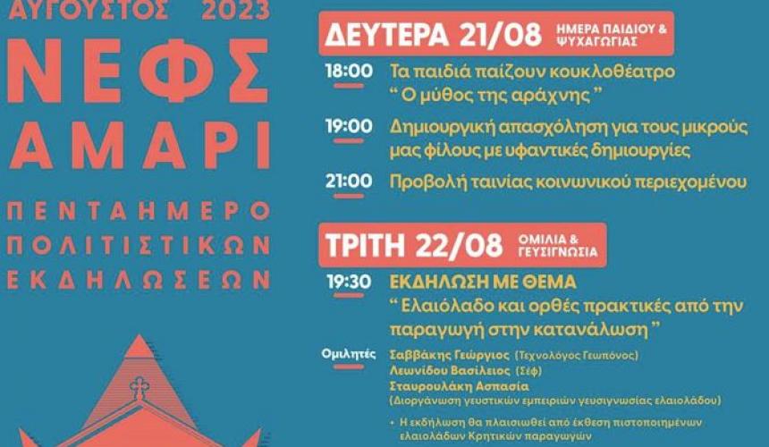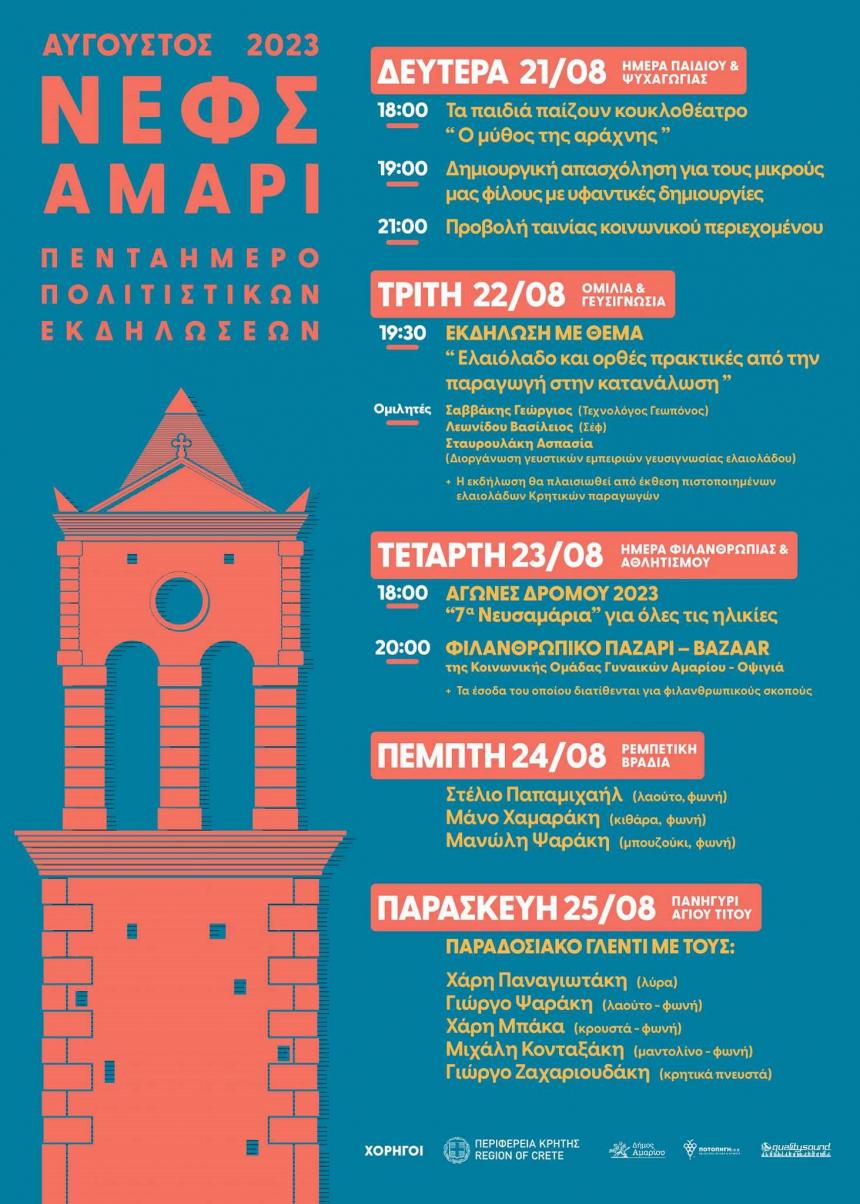 20:00: Φιλανθρωπικό Παζάρι – Βazaar της Κοινωνικής Ομάδας Γυναικών Αμαρίου-Οψιγιά», τα έσοδα του οποίου διατίθενται για φιλανθρωπικούς σκοπούς. Χειροποίητα παραδοσιακά προϊόντα φτιαγμένα με μεράκι από τις γυναίκες Νευς Αμαρίου και Οψιγιά.