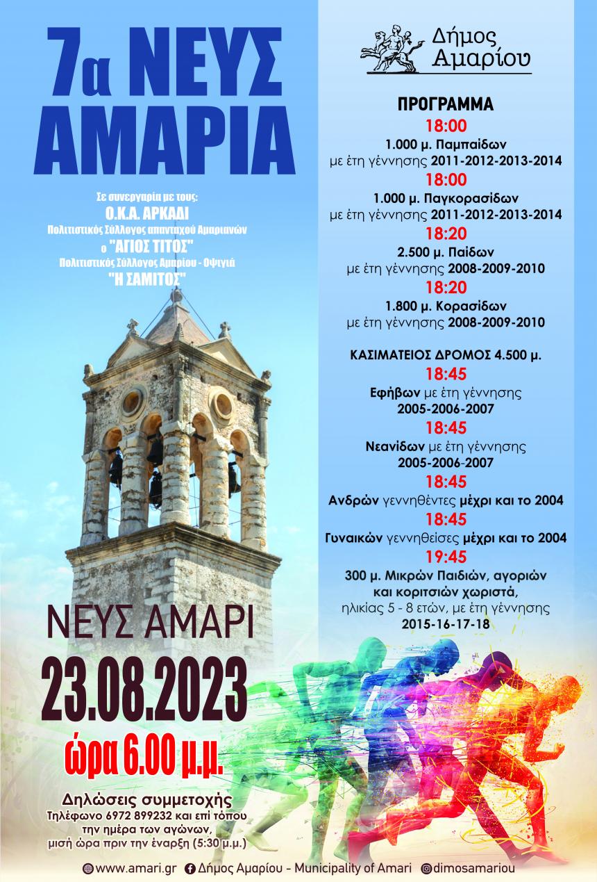 Ο Δήμος Αμαρίου σε συνεργασία με τον Πολιτιστικό Σύλλογο Αμαρίου - Οψιγιά «Η ΣΑΜΙΤΟΣ», τον Πολιτιστικό Σύλλογο απανταχού Αμαριανών ο «ΑΓΙΟΣ ΤΙΤΟΣ», και τον Ο.Κ.Α. ΑΡΚΑΔΙ, διοργανώνουν τους αγώνες δρόμου «7α ΝΕΥΣΑΜΑΡΙΑ», στις 23 Αυγούστου 2023, ημέρα Τετάρτη και ώρα 6:00 μ.μ. στο Νευς Αμάρι, στο πλαίσιο των εκδηλώσεων της γιορτής του Αγίου Τίτου, με ελεύθερη συμμετοχή στις παρακάτω κατηγορίες: