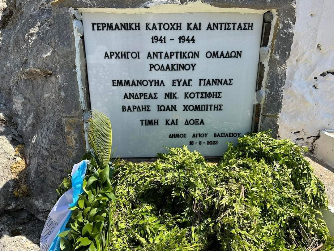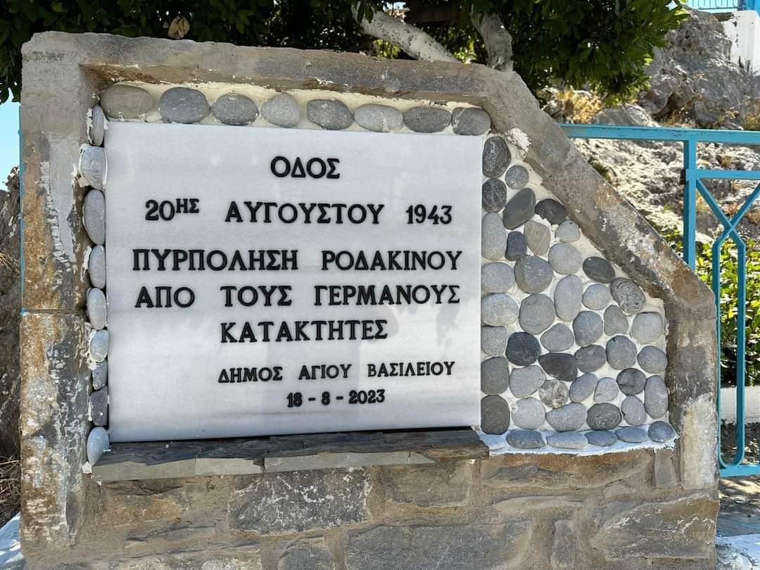 Την δεύτερη μέρα, Παρασκευή 18/8/2023 έγινε εκδήλωση στο μνημείο των ηρώων , στο Κάτω Ροδάκινο. Έγινε αποκάλυψη δύο μαρμάρινων πλακών. Στην πρώτη αναγράφονται τα ονόματα των τριών αρχηγών των αντάρτικων ομάδων του Ροδάκινου, δηλαδή του Μανώλη Γιαννά, του Αντρέα Κοτσίφη και του Βαρδή Χομπίτη , ενώ με τη δεύτερη ο δρόμος που περνάει μπροστά από το μνημείο των ηρώων ονομάστηκε «ΟΔΟΣ 20ης ΑΥΓΟΥΣΤΟΥ 1943.»