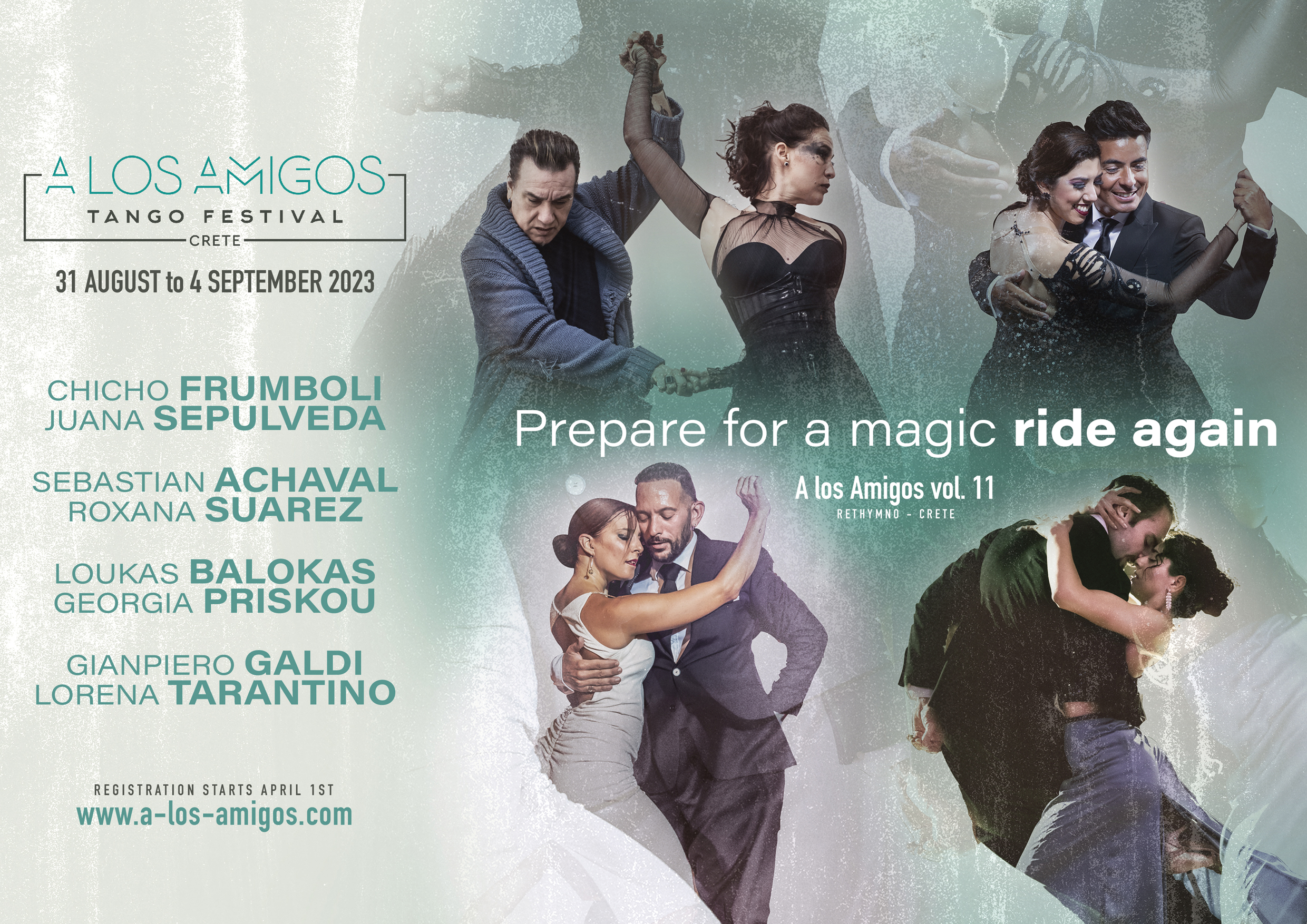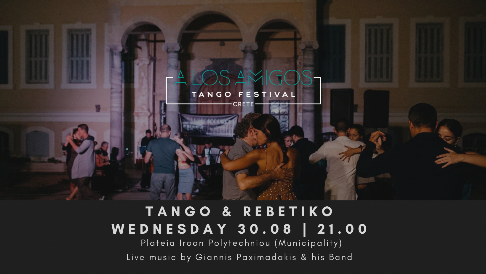Από τις 31 Αυγούστου έως και τις 4 Σεπτεμβρίου το φεστιβάλ θα ανοίξει τις πύλες του για όλους τους εραστές του τάνγκο, που επιλέγουν το A los Amigos για να συνδυάσουν διακοπές με υψηλής ποιότητας μαθήματα & παρουσιάσεις. Σε τρεις διαφορετικούς χώρους της πόλης οι συμμετέχοντες απολαμβάνουν ένα τέλειο συνδυασμό πολιτισμού & κρητικής φιλοξενίας με φόντο το μαγευτικό Ρέθυμνο.