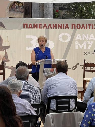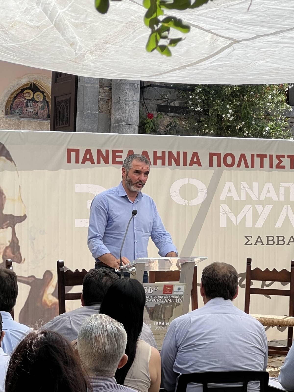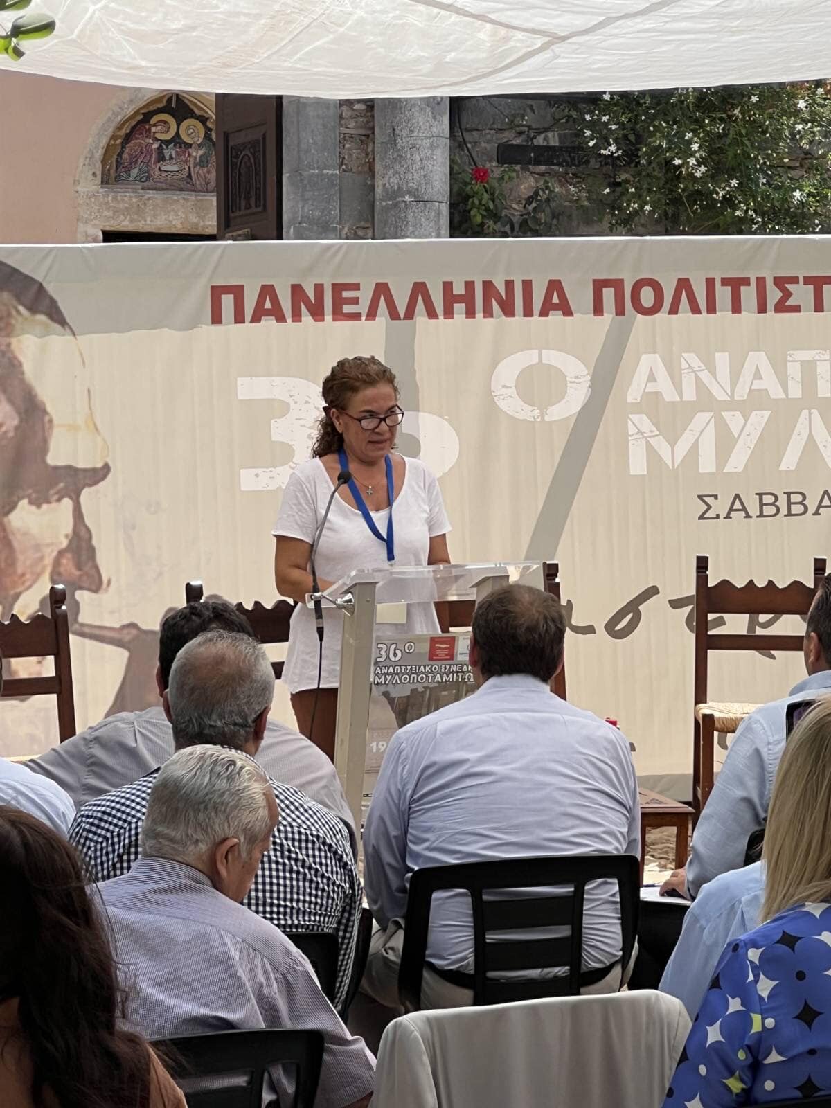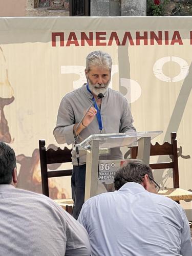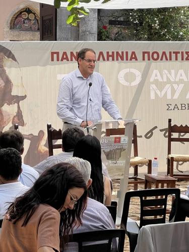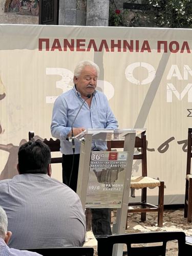 Για το θέμα «Τοπική Ιστορία και Παράδοση. Το παράδειγμα του Παγκόσμιου Νίκου Καζαντζάκη», τόνισε ότι ο σκοπός που επελέγη είναι «η γειτνίαση του γενέθλιου τόπου, το χωριό Κρυονέρι (Ασσυρώτοι), εκ της μητέρας του Παγκόσμιου λογοτέχνη Νίκου Καζαντζάκη και αυτό μας ενδυναμώνει με την ευγενική προσφορά του τοπικού πολιτιστικού Συλλόγου Κρυονερίου που έχει πρόεδρο την Ελένη Βερτούδου. Μεταξύ άλλων επισήμανε: «Στόχος μας είναι και η ανάδειξη, διαφύλαξη και αναστήλωση της οικίας της μητέρας του Νίκου Καζαντζάκη η οποία θα αποτελέσει σημείο αναφοράς με απώτερο σκοπό την περαιτέρω αξιοποίηση της ιστορικής αυτής περιοχής». Στο τέλος του χαιρετισμού του ευχαρίστησε ένα ένα ξεχωριστά όλους όσους συνέβαλλαν στην επιτυχία του Συνεδρίου καθώς και τον Μέγα Χορηγό Μεγαλοεπιχειρηματία στην Αμερική Γιώργο Σιγανό για τον μεγάλο χρηματικό έπαθλο που πρόσφερε, στο πλαίσιο του Συνεδρίου, στους τιμώμενους φοιτητές της περιοχής του Μυλοποτάμου.