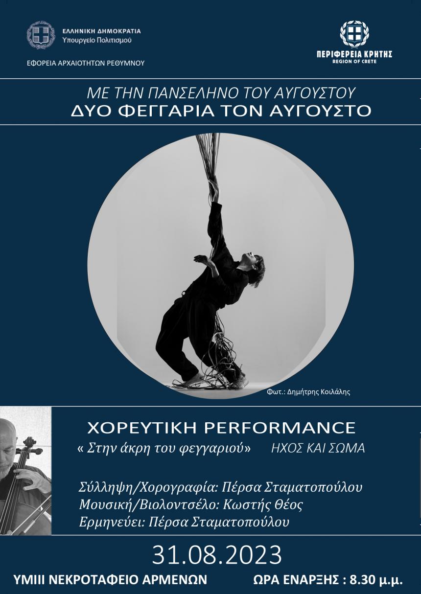 Η εκδήλωση, με την Ομάδα Σύγχρονου Χορού Πέρσας Σταματοπούλου και θέμα «Στην άκρη του φεγγαριού» Ήχος και Σώμα, θα γίνει στο Υστερομινωικό ΙΙΙ Νεκροταφείο Αρμένων, την Πέμπτη 31 Αυγούστου 2023 και ώρα 8.30 μ.μ.