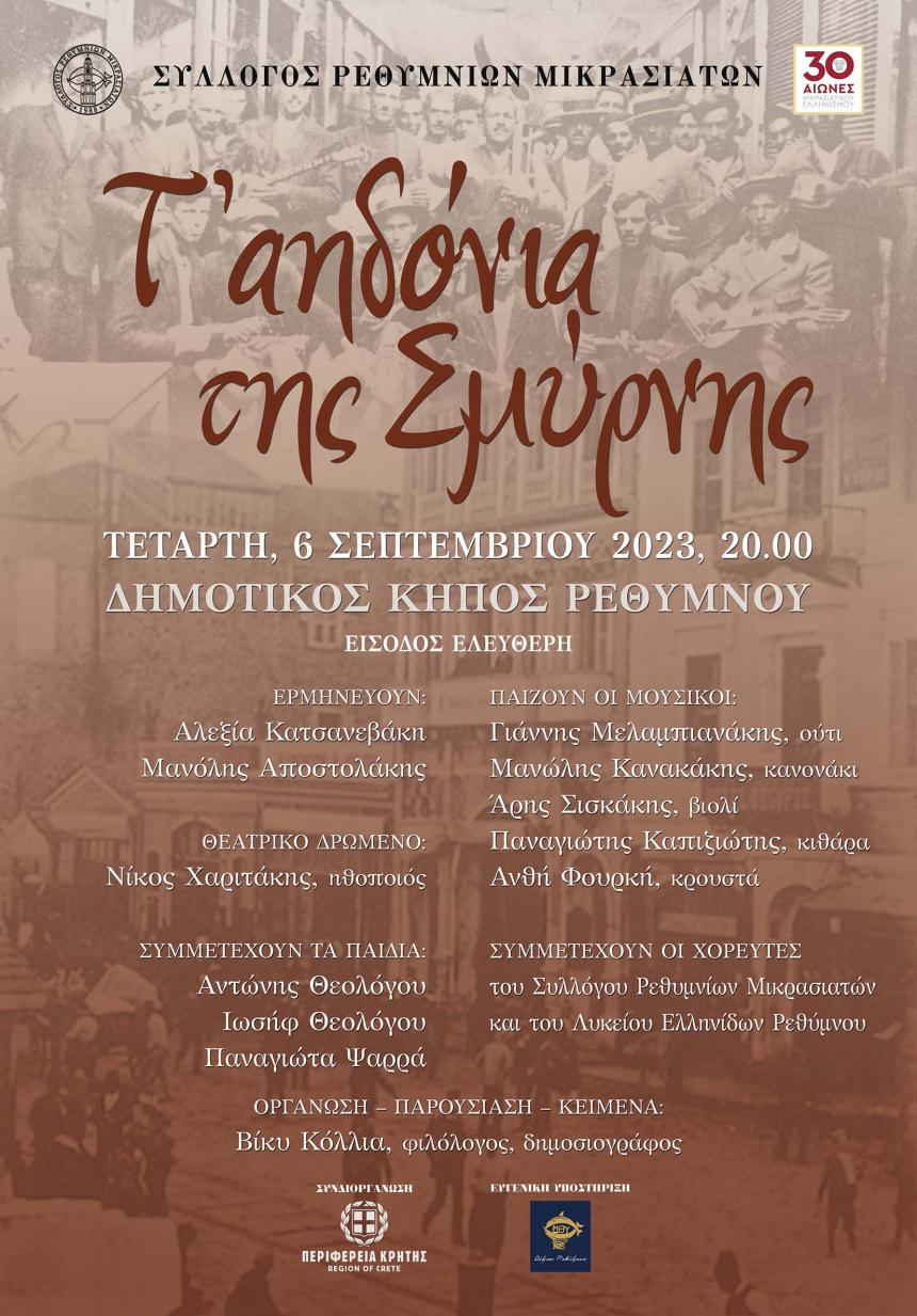 Ο Σύλλογος Ρεθυμνίων Μικρασιατών σας καλεί στη μουσική παράσταση "Τ' αηδόνια της Σμύρνης ". Μια βραδιά αφιερωμένη στους Σμυρναίους συνθέτες που άνοιξαν τον δρόμο για το ρεμπέτικο τραγούδι που όλοι αγαπάμε . Η βραδιά περιλαμβάνει τραγούδια, θεατρικό, χορούς και κείμενα αφηγηματικά με στόχο να μπει ο θεατής - ακροατής στο κλίμα της εποχής, πριν και λίγο μετά το δραματικό 1922. Τη Τετάρτη 6/9/2023 και ώρα 20:00 το Δημοτικό Κήπο Ρεθύμνου.