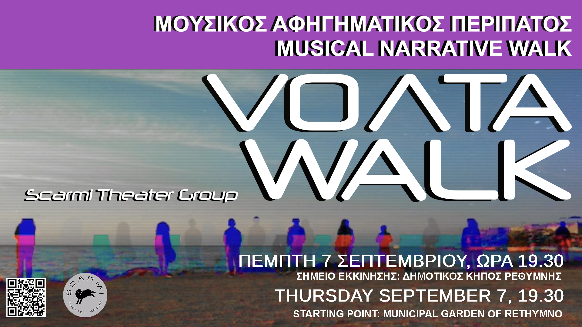 με βάση το Ρέθυμνο Κρήτης παρουσιάζει έναν μουσικό αφηγηματικό περίπατο με τη χρήση ακουστικών κεφαλής, βασισμένο στον ελεύθερο πειραματισμό μέσω της θεατρικής αφήγησης και της μουσικής, σε άρρηκτη σχέση με το φυσικό τοπίο. Εμπνευσμένος από σύγχρονες καθημερινές σκέψεις ανθρώπων σε συνδυασμό με λογοτεχνικά κείμενα.