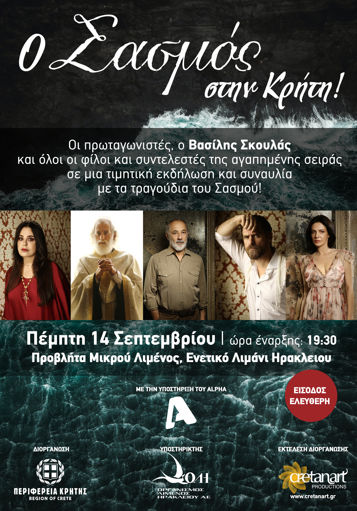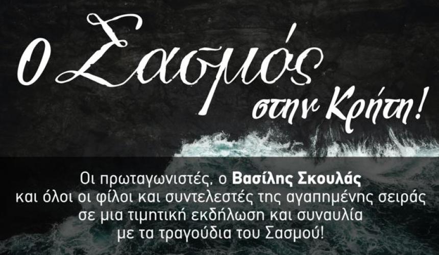 Τιμητική εκδήλωση και συναυλία με τον Βασίλη Σκουλά, όπου θα τιμηθούν οι πρωταγωνιστές της αγαπημένης τηλεοπτικής σειράς του Αlpha «Σασμός» θα πραγματοποιηθεί την Πέμπτη 14 Σεπτεμβρίου στις 19:30 στο Ενετικό λιμάνι του Ηρακλείου. Η εκδήλωση διοργανώνεται από την Περιφέρεια Κρήτης με την υποστήριξη του τηλεοπτικού σταθμού Αlpha παρουσία των πρωταγωνιστών ενώ θα ακουστούν τα τραγούδια της τηλεοπτικής σειράς.