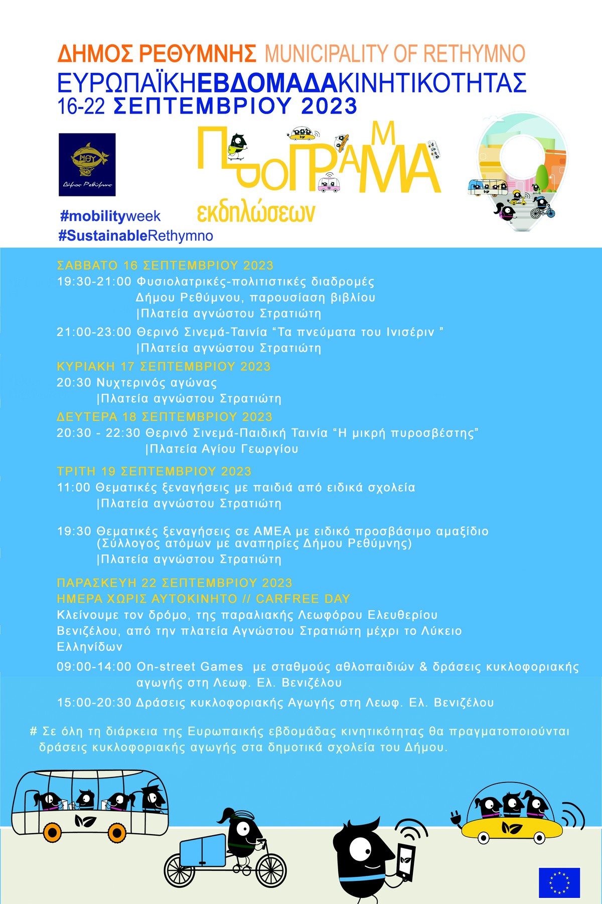 Για ένατη συνεχόμενη χρονιά, ο Δήμος Ρεθύμνης συμμετέχει στην «ΕΥΡΩΠΑΙΚΗ ΕΒΔΟΜΑΔΑ ΚΙΝΗΤΙΚΟΤΗΤΑΣ» που πραγματοποιείται κάθε χρόνο σε πολλές Ευρωπαϊκές χώρες, από τις 16 έως τις 22 Σεπτεμβρίου 2023. Μεταξύ των χωρών είναι και η Ελλάδα, όπου ο θεσμός στηρίζεται από το Υπουργείο Περιβάλλοντος & Ενέργειας, δίνοντας σε Δήμους την ευκαιρία να σχεδιάσουν και υλοποιήσουν στοχευμένες δράσεις και μαζί με τους πολίτες να ανακαλύψουν και να δημιουργήσουν νέους βιώσιμους και εναλλακτικούς τρόπους μετακίνησης μέσα στις πόλεις τους, ενθαρρύνοντας και προωθώντας τη Βιώσιμη Κινητικότητα.