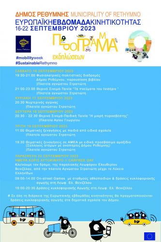 - Σάββατο 16 Σεπτεμβρίου 2023: Έναρξη των εκδηλώσεων Ευρωπαϊκής Εβδομάδας Κινητικότητας, στην πλατεία Αγνώστου Στρατιώτη. Στις 19:30 θα γίνει παρουσίαση φυσιολατρικών διαδρομών Δήμου Ρεθύμνης, παρουσίαση βιβλίου και στις 21:00 προβολή ταινίας .