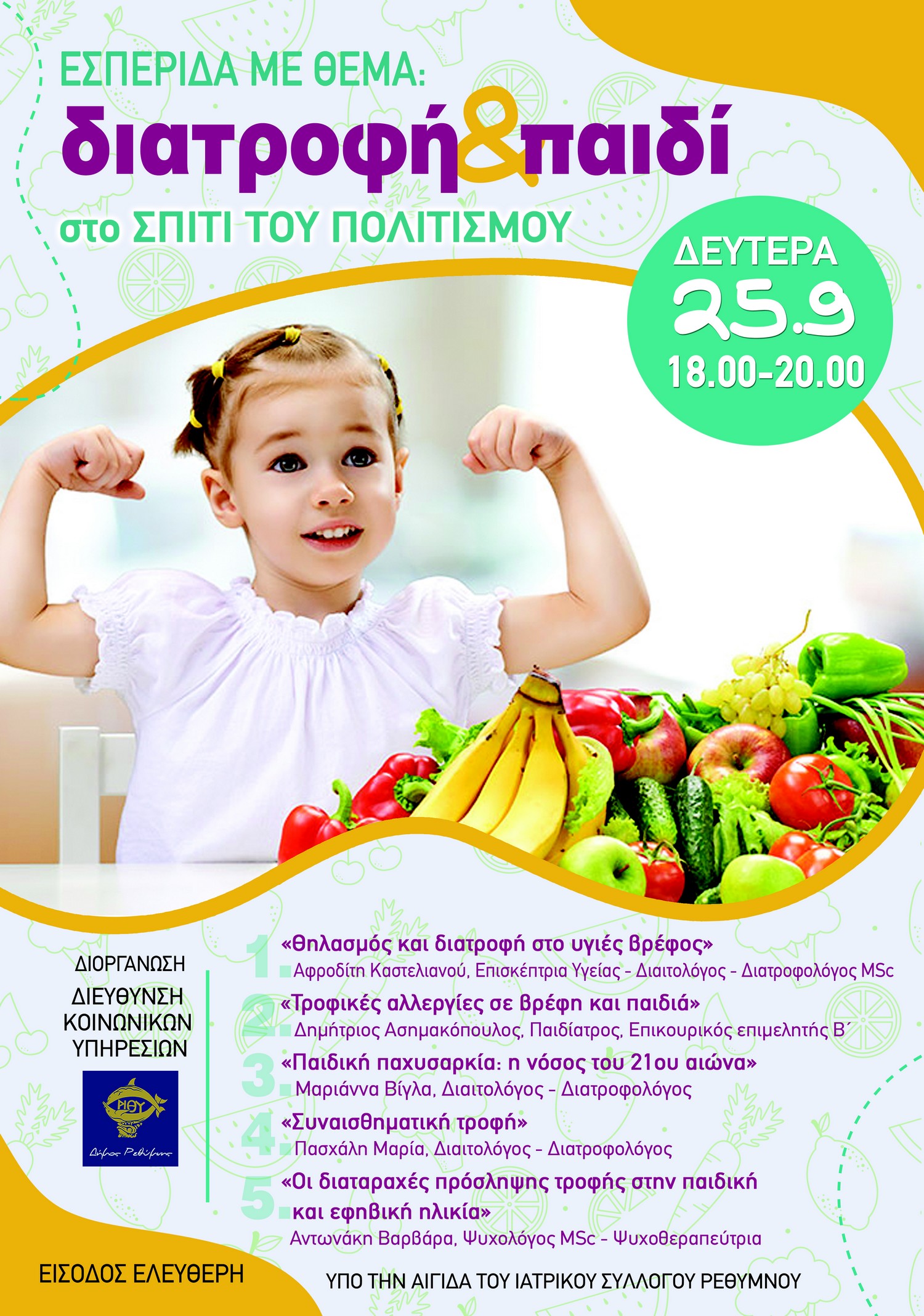 Η Κοινωνική Υπηρεσία επενδύοντας σταθερά στην έγκυρη ενημέρωση, την πρόληψη και την ορθή πληροφόρηση, γονέων , εκπαιδευτικών, επαγγελματιών υγείας και όλων των συμπολιτών, σε θέματα ψυχικής και βιολογικής υγείας, με ιδιαίτερη μέριμνα σε θέματα που αφορούν παιδιά, διοργανώνει Εσπερίδα με επίκεντρο τη διατροφή των παιδιών.