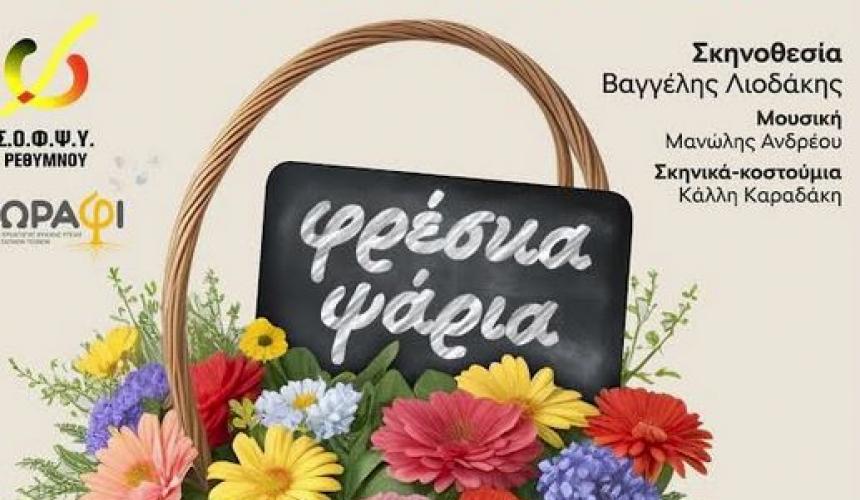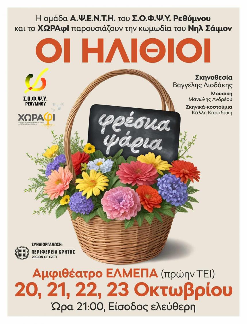 Η θεατρική ομάδα Α.Ψ.Ε.Ν.Τ.Η (Από Ψυχής Εθελοντής Νέος τώρα Ηθοποιός) του Συλλόγου Οικογενειών και Φίλων για την Ψυχική Υγεία (Σ.Ο.Φ.Ψ.Υ) Ρεθύμνου και το ΧΩΡΑφΙ, με τη συνδιοργάνωση της Περιφέρειας Κρήτης (Αντιπεριφέρεια Ρεθύμνου), παρουσιάζουν την κωμωδία του Νηλ Σάιμον «Οι Ηλίθιοι».