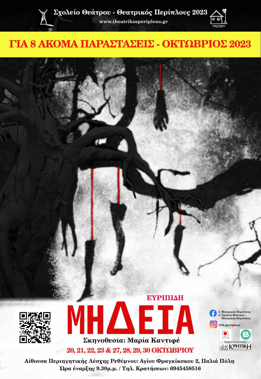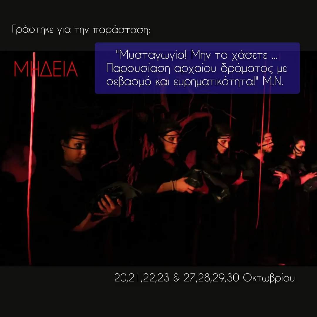 Η παράσταση της «Μήδειας» ανέβηκε για πρώτη φορά τον Ιούλιο γεμίζοντας την παλιά πόλη του Ρεθύμνου από θεατρόφιλους θεατές και αποσπώντας το πιο δυνατό τους χειροκρότημα. Η καλοκαιρινή, λοιπόν, επιτυχία θα μαγέψει ξανά το κοινό ξεκινώντας από αυτή την Παρασκευή 20 Οκτωβρίου στην αίθουσα της Περιηγητικής Λέσχης Ρεθύμνου για να μας μεταφέρει στο μυσταγωγικό κλίμα της αρχαίας τραγωδίας και να «αναγεννήσει» τη Μήδεια, όπως την έγραψε ο Ευριπίδης και την συνέλαβε σκηνοθετικά η ηθοποιός και σκηνοθέτιδα, Μαρία Καντιφέ.