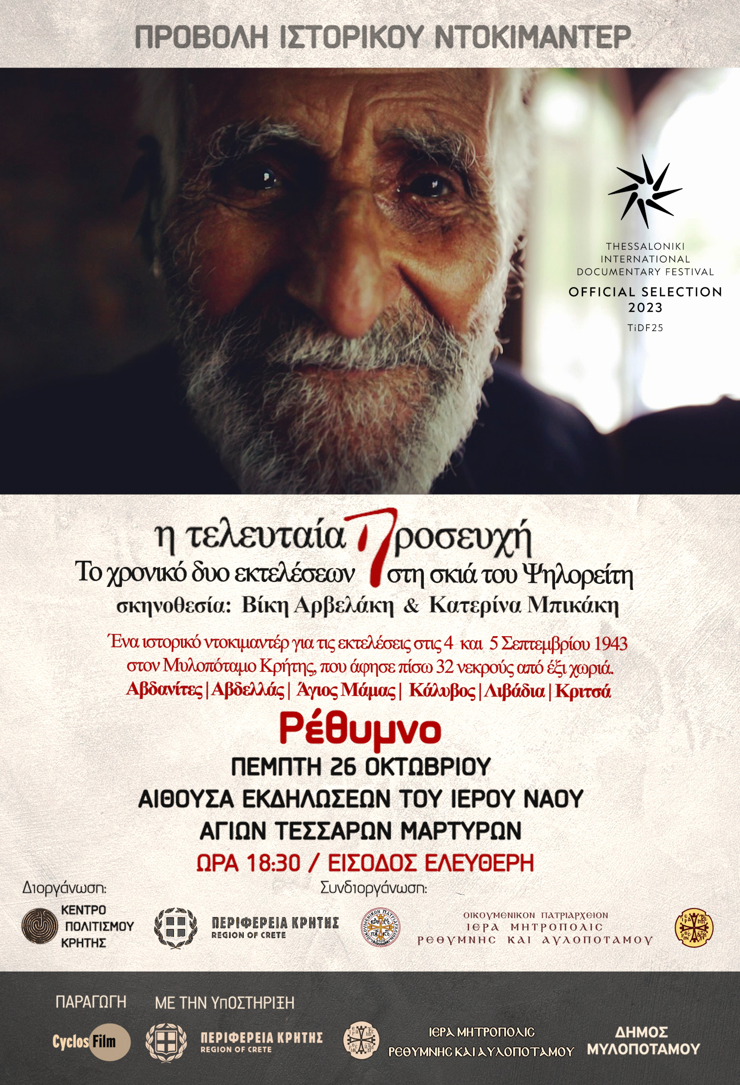 «Η Τελευταία Προσευχή: Το χρονικό δυο εκτελέσεων στη σκιά του Ψηλορείτη» θα προβληθεί στο Ρέθυμνο, την Πέμπτη 26 Οκτωβρίου 2023 και ώρα 18:30, στην αίθουσα εκδηλώσεων του Ιερού Ναού των Αγίων Τεσσάρων Μαρτύρων, στα πλαίσια του Εορτασμού της Μνήμης των Αγίων Τεσσάρων Νεομαρτύρων, Γεωργίου, Αγγελή, Μανουήλ και Νικολάου των εν Ρεθύμνη μαρτυρησάντων, η οποία συμπίπτει με την Εθνική Επέτειο της 28ης Οκτωβρίου.