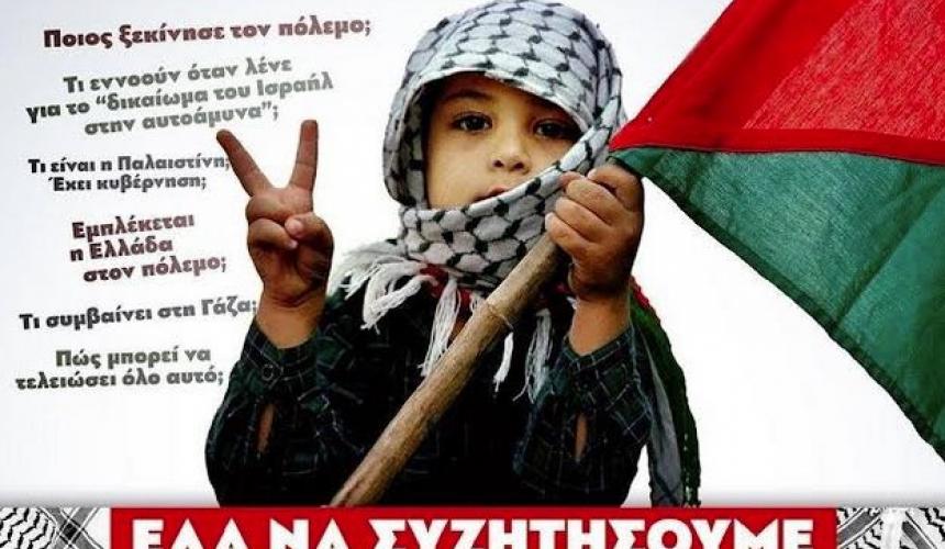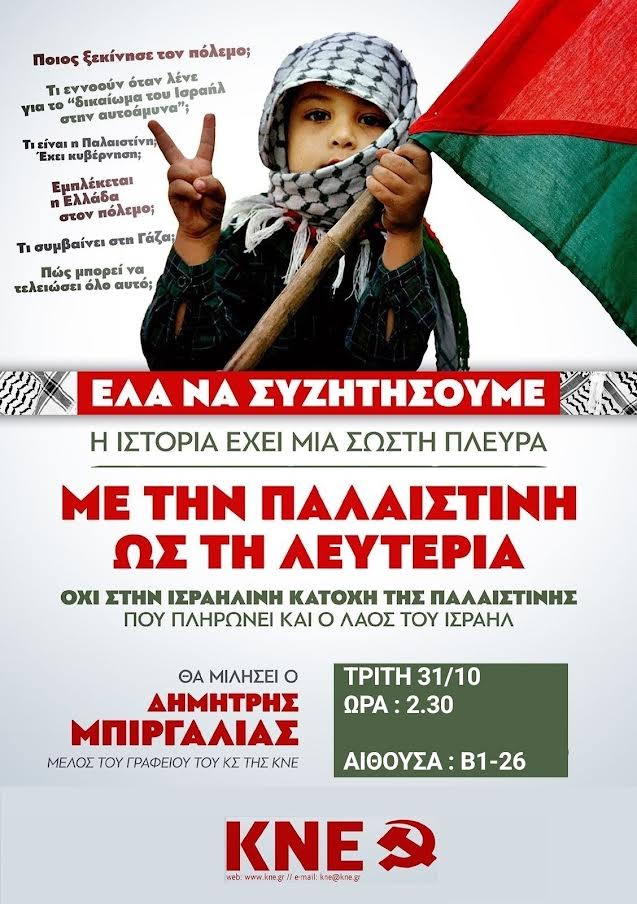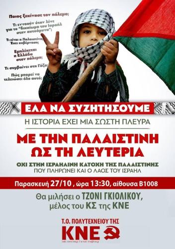 Εκδήλωση - συζήτηση για το έγκλημα που διεξάγεται στην Παλαιστίνη οργανώνουν η Τομεακή Οργάνωση Πολυτεχνείου της ΚΝΕ και η Τομεακή Οργάνωση Ρεθύμνου της ΚΝΕ αντίστοιχα.