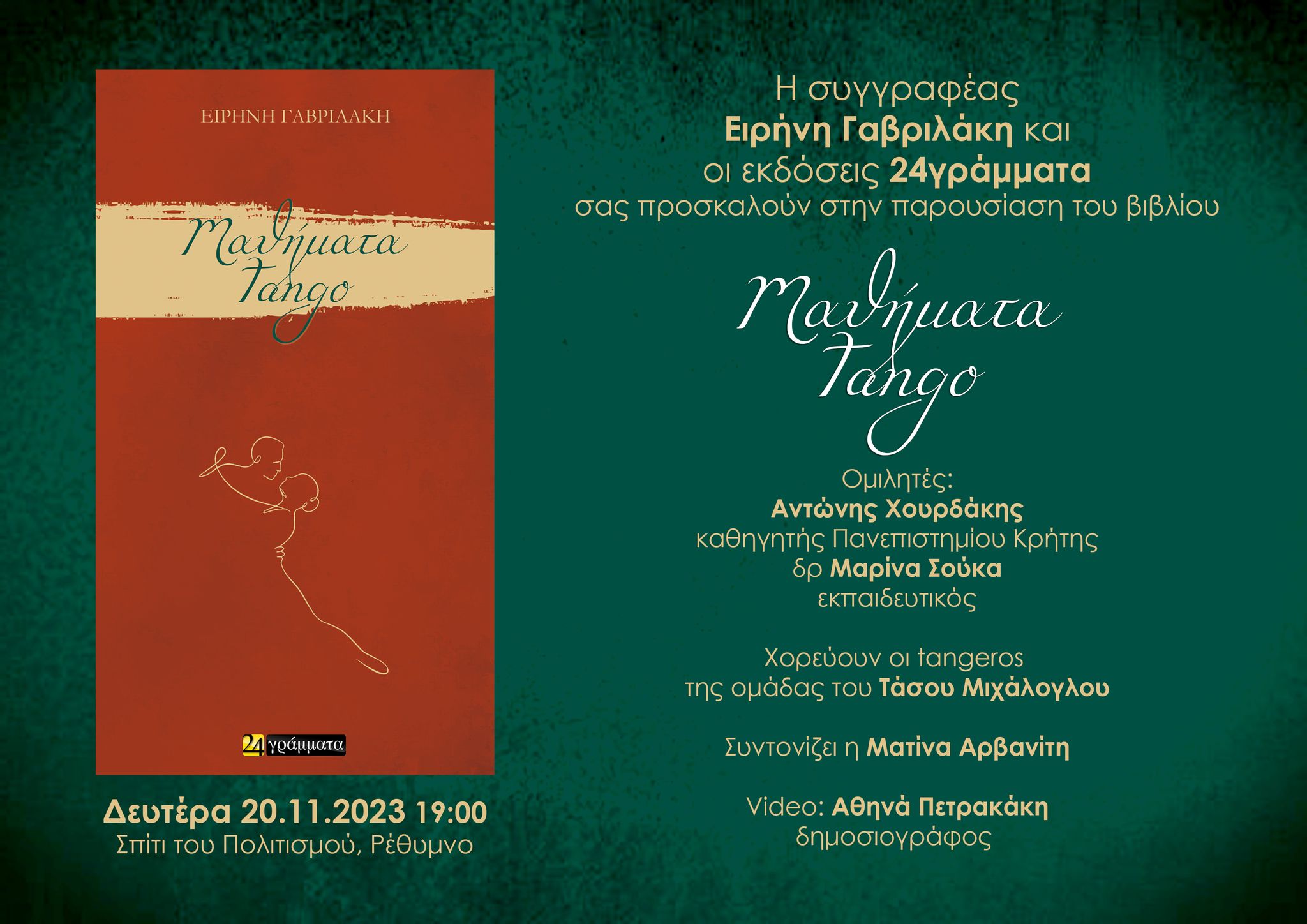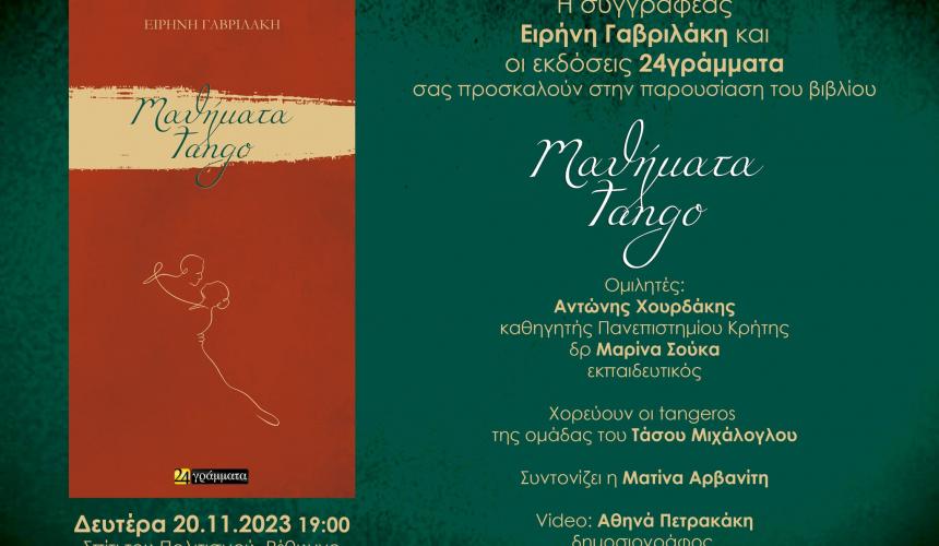 Τη Δευτέρα, 20 Νοεμβρίου 2023 (Σπίτι του Πολιτισμού, 19:00), παρουσιάζεται το νέο βιβλίο της αρχαιολόγου και συγγραφέα Ειρήνης Γαβριλάκη Μαθήματα tango (εκδόσεις 24γράμματα, 2023).
