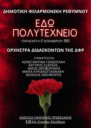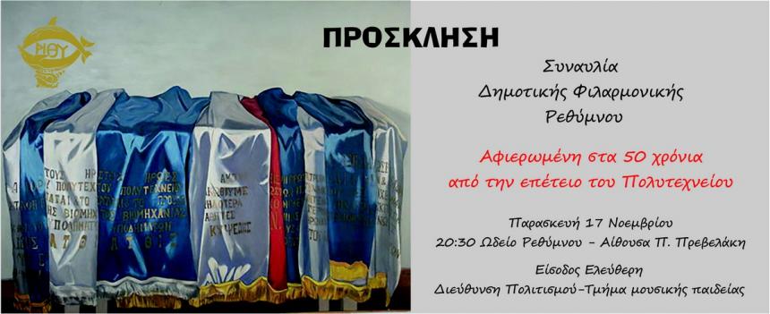 Ο Δήμος Ρεθύμνης και το Τμήμα Πολιτισμού – Μουσικής Παιδείας μαζί με την ορχήστρα διδασκόντων της Δημοτικής Φιλαρμονικής Ρεθύμνου, σας προσκαλούν σε μια συναυλία – αφιέρωμα για την 50η επέτειο του Πολυτεχνείου, την Παρασκευή 17 Νοεμβρίου στις 20:30 στην αίθουσα Παντελής Πρεβελάκης στο Ωδείο Ρεθύμνου.