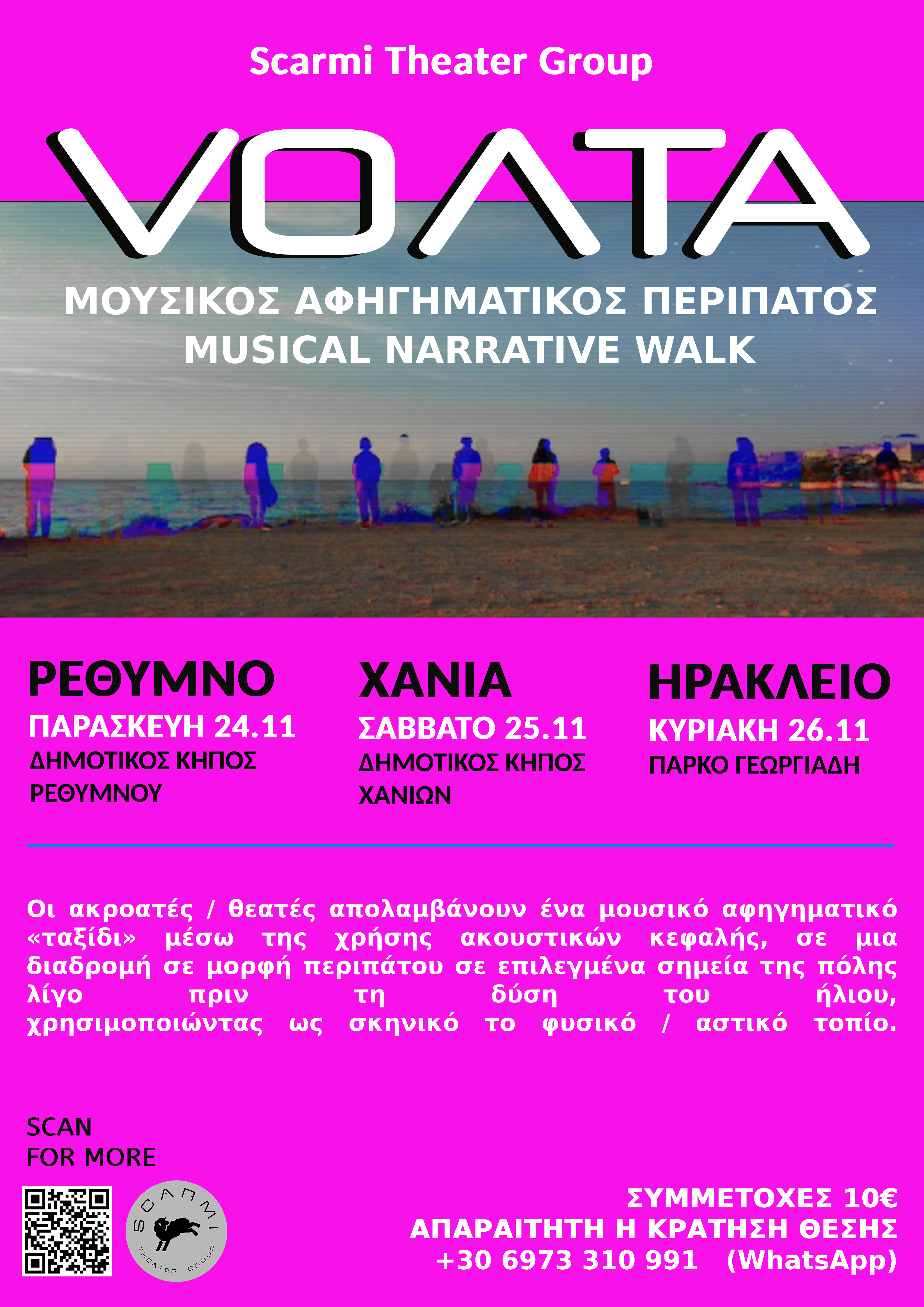 με βάση το Ρέθυμνο Κρήτης παρουσιάζει έναν μουσικό αφηγηματικό περίπατο με τη χρήση ακουστικών κεφαλής, βασισμένο στον ελεύθερο πειραματισμό μέσω της θεατρικής αφήγησης και της μουσικής, σε άρρηκτη σχέση με το φυσικό τοπίο.