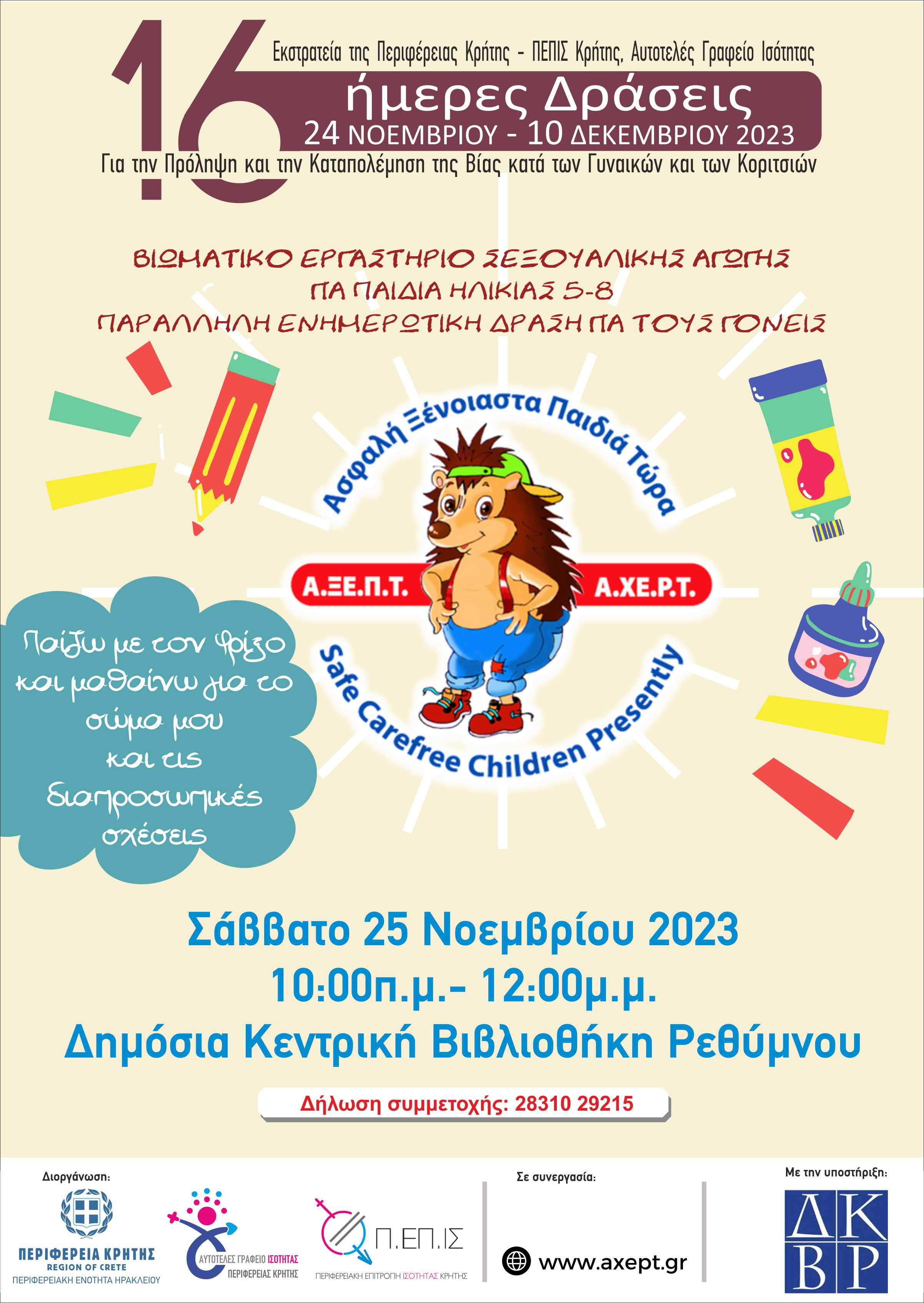 Στα πλαίσια της εκστρατείας για την Πρόληψη και την Καταπολέμηση της Βίας κατά των Γυναικών και των Κοριτσιών η Περιφέρεια Κρήτης, η Περιφερειακή Επιτροπή Ισότητας των Φύλων – ΠΕΠΙΣ, η Περιφερειακή Ενότητα Ρεθύμνου, η Διεύθυνση Δημόσιας Υγείας και Κοινωνικής Μέριμνας ΠΕ Ρεθύμνου και η Α.ΞΕ.Π.Τ. Ασφαλή Ξένοιαστα Παιδιά Τώρα σε συνεργασία με τη Δημόσια Κεντρική Βιβλιοθήκη Ρεθύμνου διοργανώνουν το Σάββατο 25 Νοεμβρίου 2023 και ώρα 10π.μ. με 11.30π.μ. στον χώρο της Δημόσιας Κεντρικής Βιβλιοθήκης Ρεθύμνου: