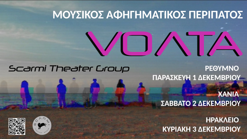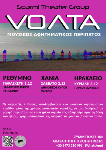 Η θεατρική ομάδα Scarmi, με βάση το Ρέθυμνο Κρήτης παρουσιάζει έναν μουσικό αφηγηματικό περίπατο με τη χρήση ακουστικών κεφαλής, βασισμένο στον ελεύθερο πειραματισμό μέσω της θεατρικής αφήγησης και της μουσικής, σε άρρηκτη σχέση με το φυσικό τοπίο.