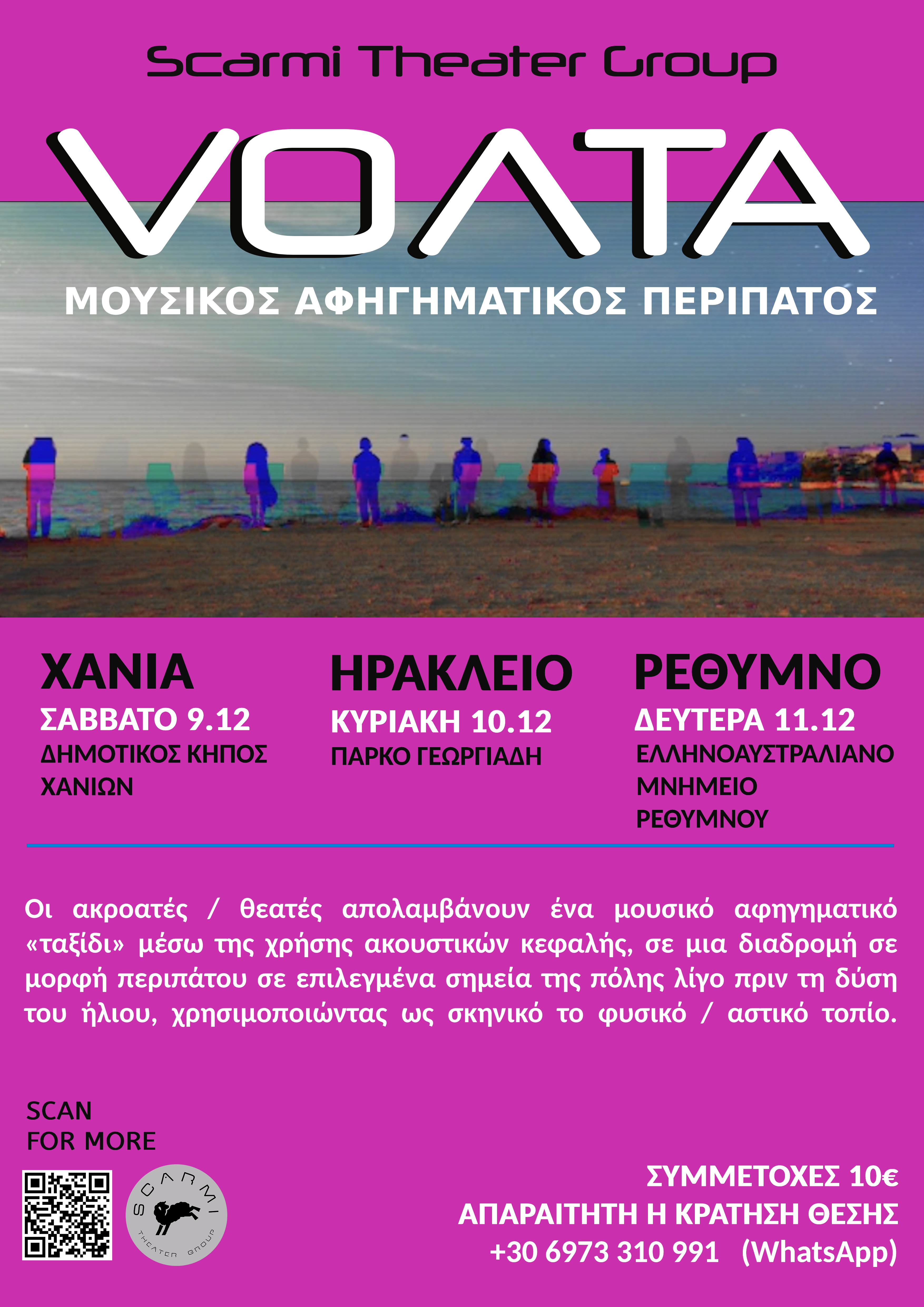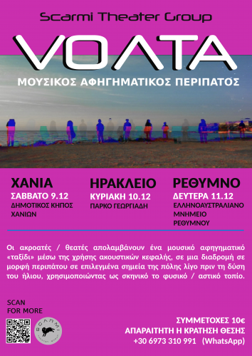 με βάση το Ρέθυμνο Κρήτης παρουσιάζει έναν μουσικό αφηγηματικό περίπατο με τη χρήση ακουστικών κεφαλής, βασισμένο στον ελεύθερο πειραματισμό μέσω της θεατρικής αφήγησης και της μουσικής, σε άρρηκτη σχέση με το φυσικό τοπίο.