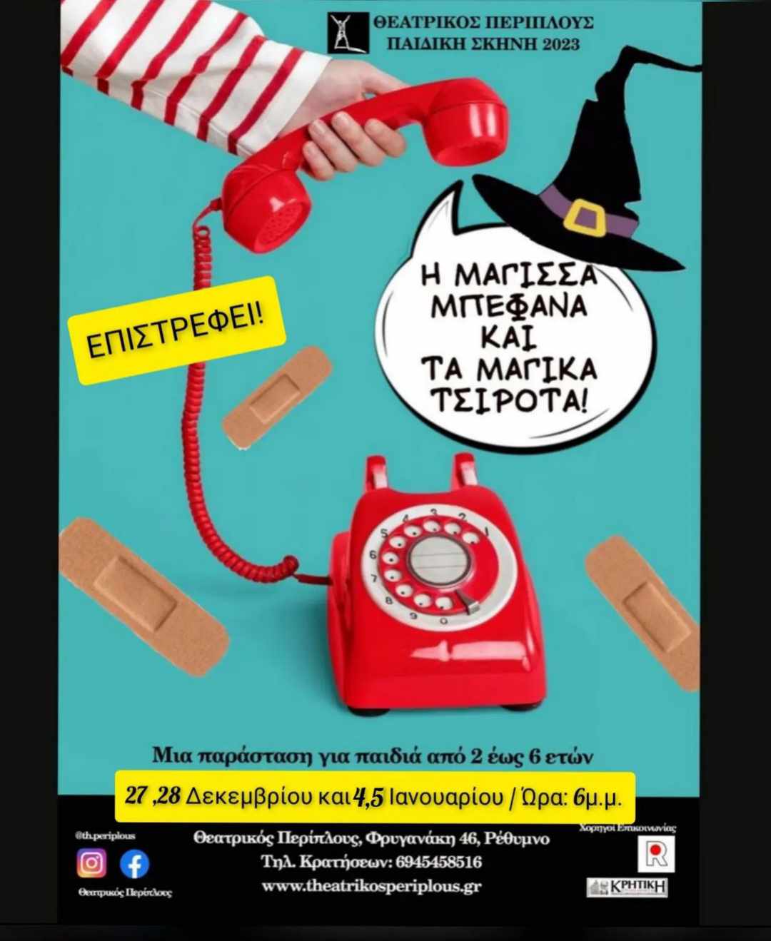 Η «Μάγισσα Μπεφάνα και τα Μαγικά Τσιρότα», που μας κράτησαν συντροφιά στην κορύφωση των χριστουγεννιάτικων εορτών, ολοκληρώνει τις παραστάσεις της. Ο Θωμάς Καντιφές γεμίζει τις μέρες των μικρών μας φίλων με πολύ θέατρο, τραγούδι και παιχνίδι για δύο ακόμη παραστάσεις: αύριο Πέμπτη 04/01 και μεθαύριο Παρασκευή 05/01 στον Θεατρικό Περίπλου.