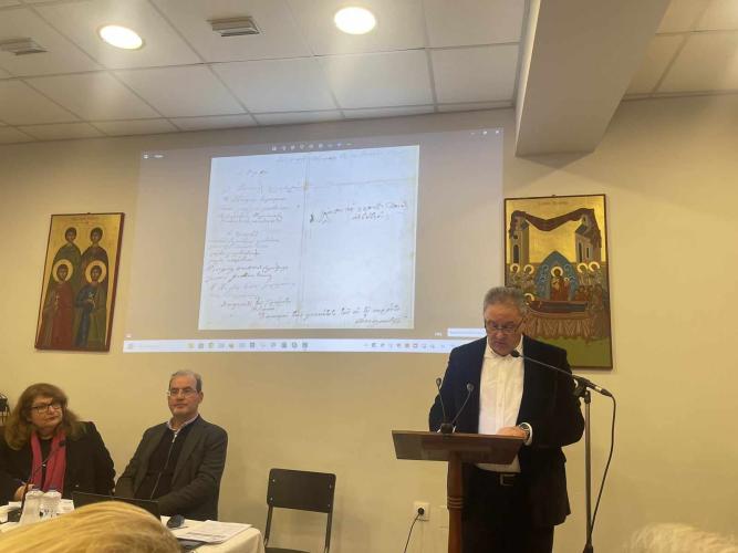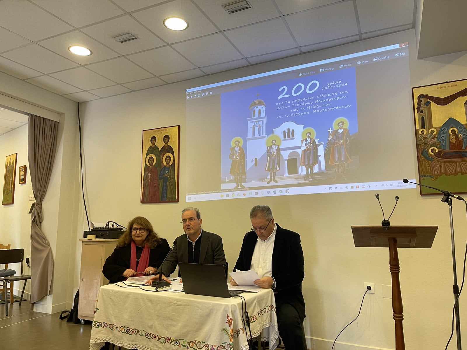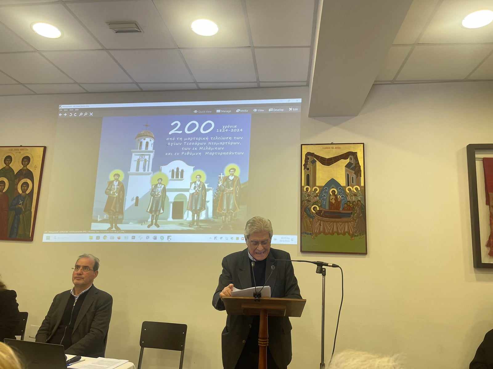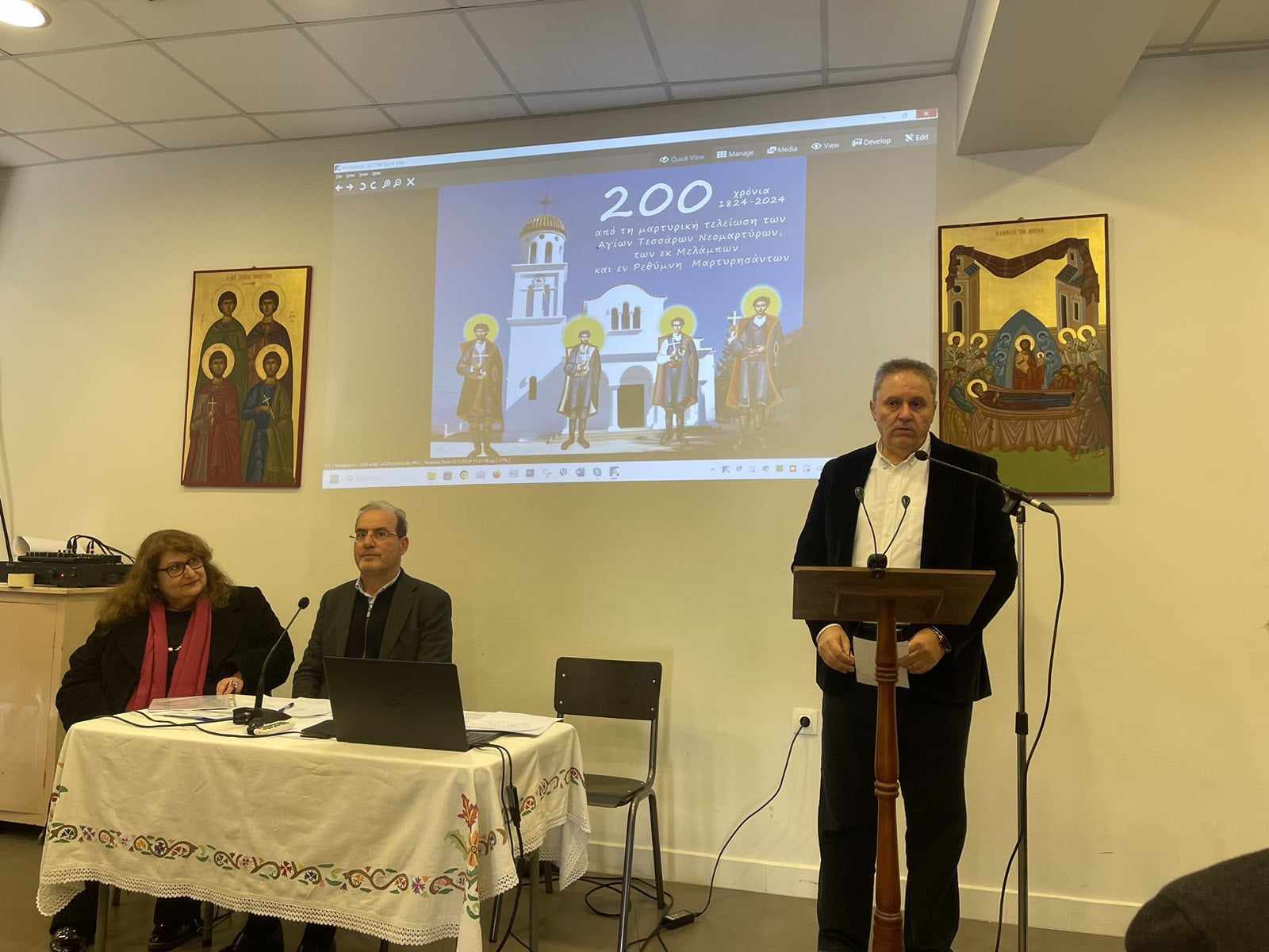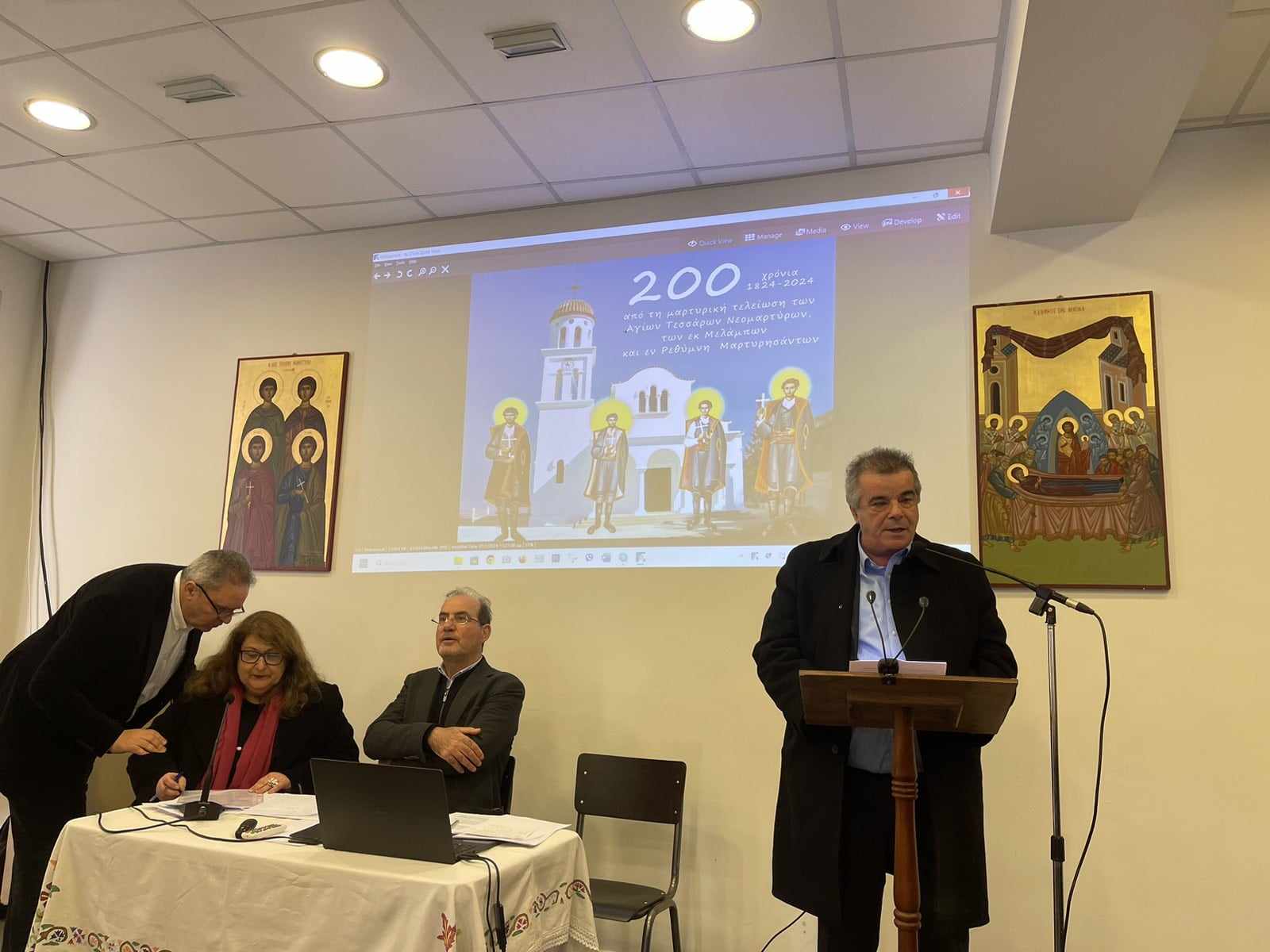 Ο κ. Αντώνης Τσουρδαλάκης, Πρόεδρος Δ.Σ. & Υπεύθυνος Παιδείας Δήμου Αγίου Βασιλείου, Δ/ντής Εσπερινού ΕΠΑΛ Σπηλίου με ιδιαίτερη συγκίνηση παρουσίασε - όπως ο ίδιος ανέφερε - ως ελάχιστο φόρο τιμής και σεβασμού στους συγχωριανούς του Αγίους τα «Νέα ιστορικά στοιχεία για τους Τέσσερις Νεομάρτυρες».