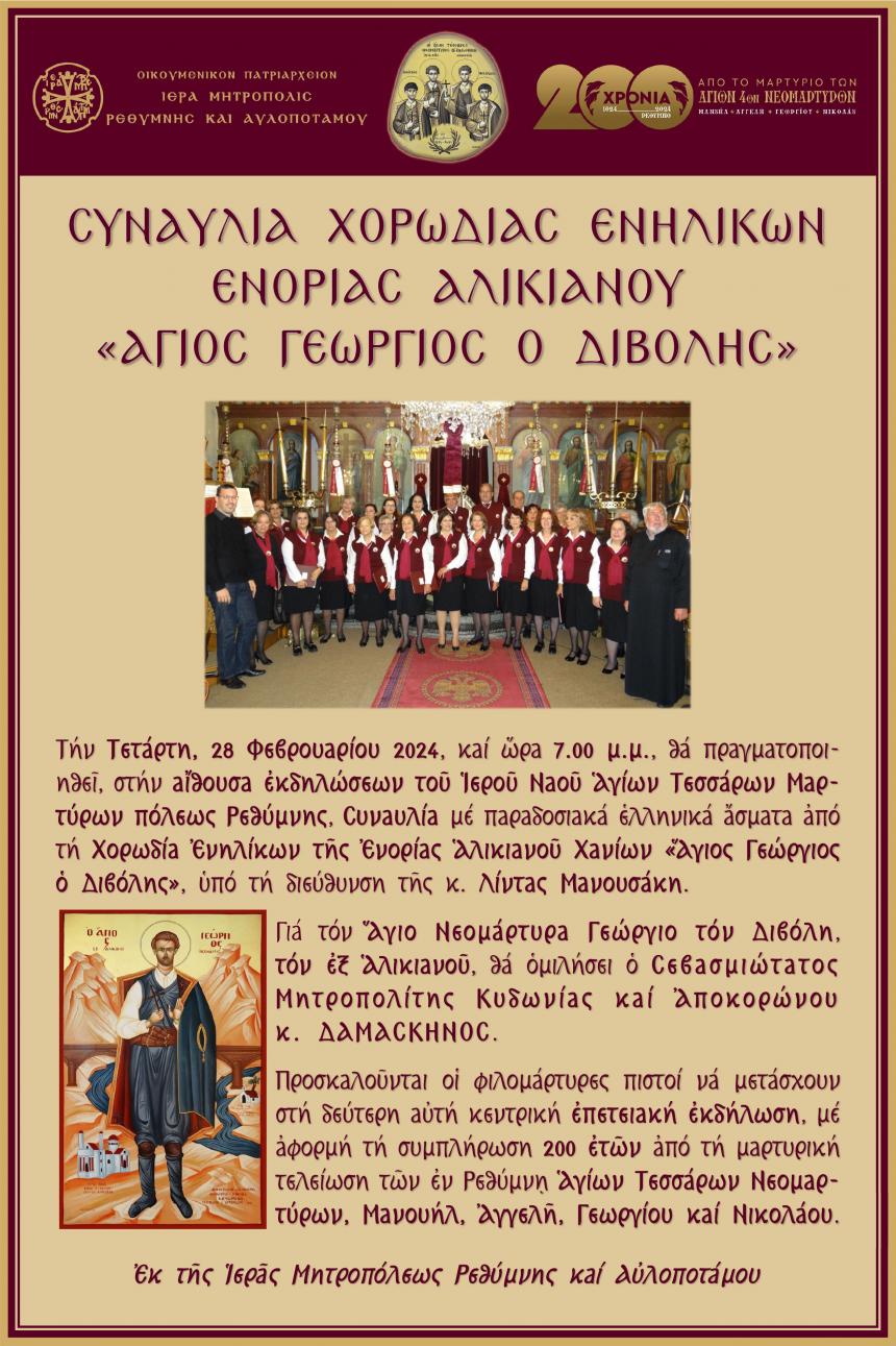 Την Τετάρτη, 28 Φεβρουαρίου 2024, και ώρα 7.00 μ.μ., θα πραγματοποιηθεί, στην αίθουσα εκδηλώσεων του Ιερού Ναού Αγίων Τεσσάρων Μαρτύρων πόλεως Ρεθύμνης, Συναυλία με παραδοσιακά ελληνικά άσματα από τη Χορωδία Ενηλίκων της Ενορίας Αλικιανού Χανίων «Άγιος Γεώργιος ο Διβόλης», υπό τη διεύθυνση της κ. Λίντας Μανουσάκη.