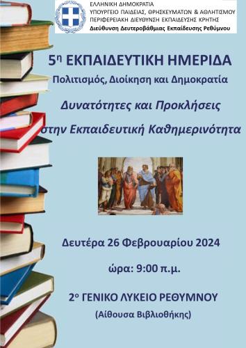 Την Δευτέρα 26 Φεβρουαρίου 2024 μετά από Πρόσκληση του Διευθυντή Δευτεροβάθμιας Εκπαίδευσης Ρεθύμνου, κ. Μανούσου Μαραγκάκη πραγματοποιήθηκε στο 2ο Γενικό Λύκειο Ρεθύμνου η 5η Ημερίδα για Διευθυντές/τριες Σχολικών Μονάδων με τίτλο: ΠΟΛΙΤΙΣΜΟΣ, ΔΙΟΙΚΗΣΗ ΚΑΙ ΔΗΜΟΚΡΑΤΙΑ: Δυνατότητες και Προκλήσεις στην Εκπαιδευτική Καθημερινότητα.