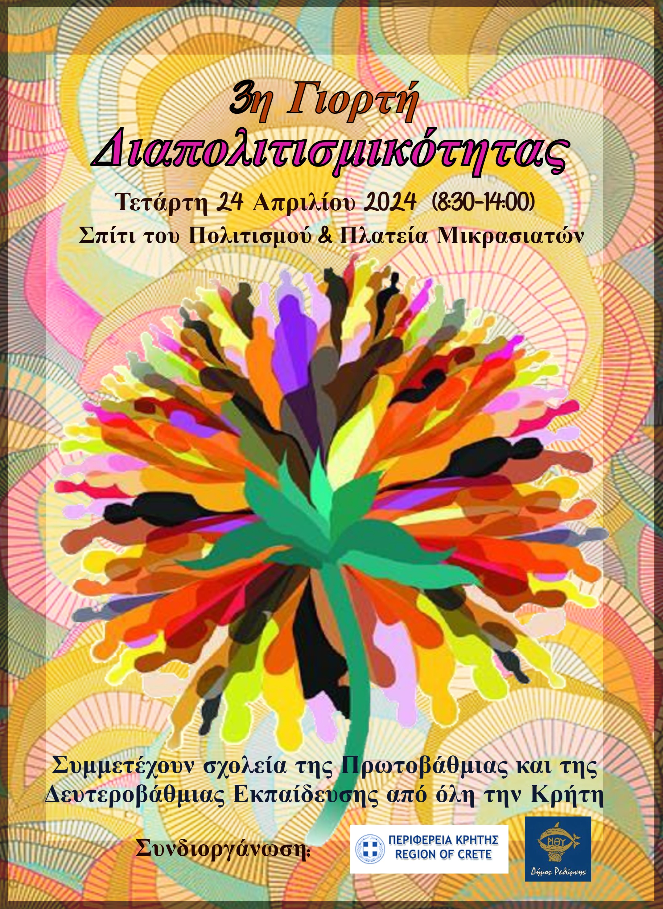 Η Εκπαιδευτική Εκδήλωση 3η Γιορτή Διαπολιτισμικότητας θα πραγματοποιηθεί την Τετάρτη 24 Απριλίου 2024 με ώρα έναρξης 09:00 σε χώρους του Δήμου Ρεθύμνου, στο «Σπίτι του Πολιτισμού» και στην Πλατεία Μικρασιατών.