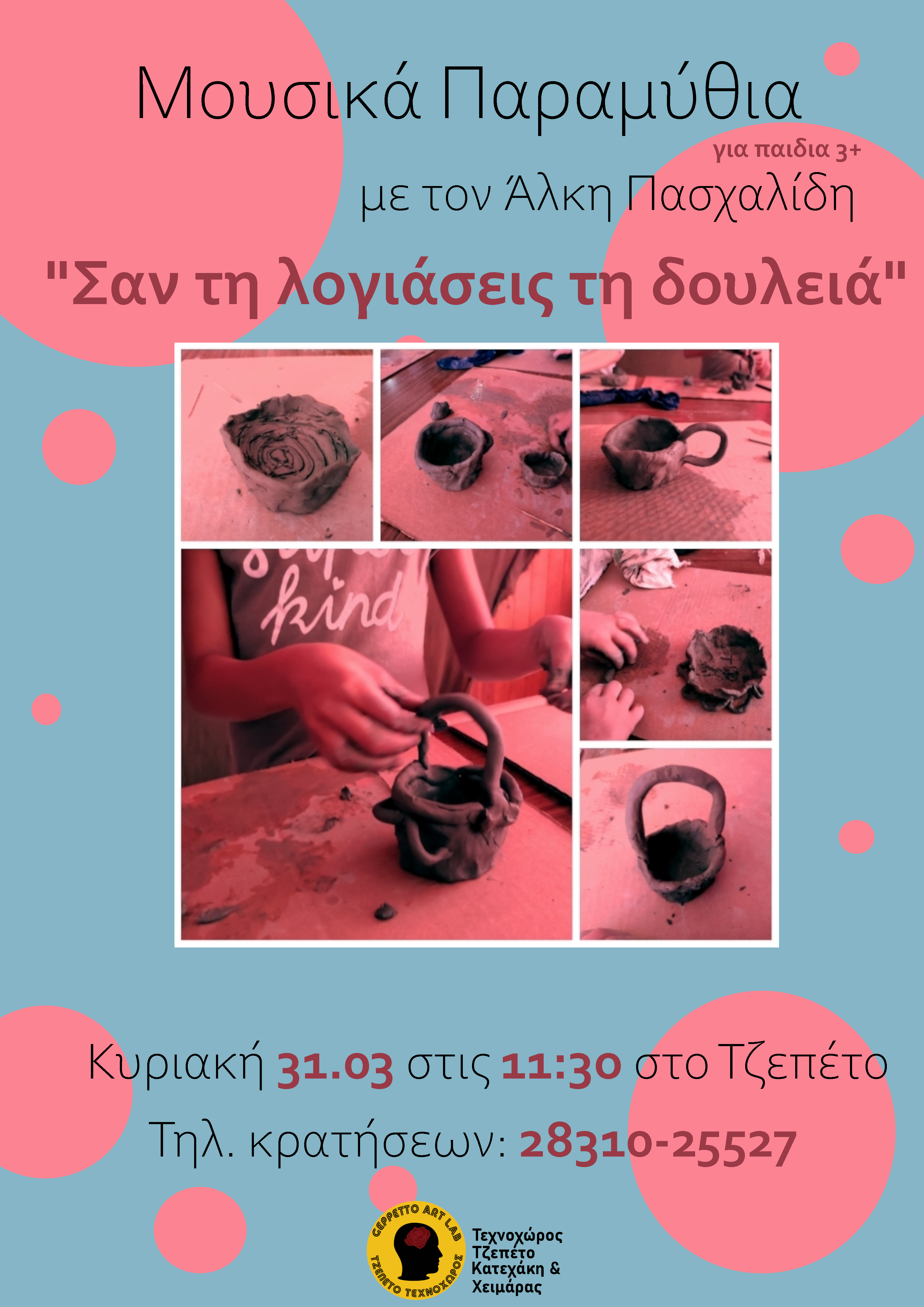 Εργαστήριο Πηλού: Με τον πιο εύπλαστο και φυσικό, χωρίς προσμίξεις, πηλό που υπάρχει πλάθουμε και φτιάχνουμε τις πρώτες κεραμικές μορφές που κατασκεύασαν οι άνθρωποι στη Γη.