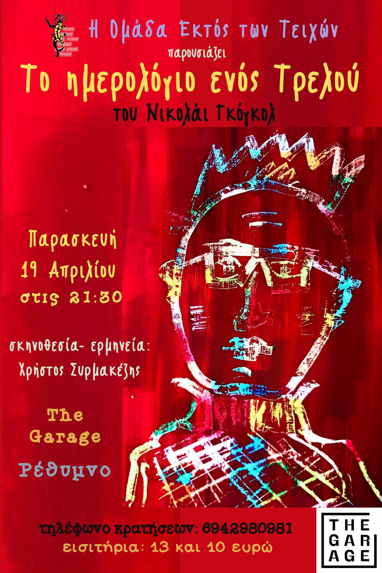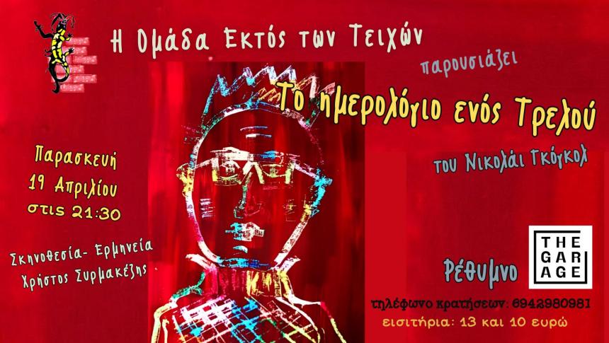 Η Ομάδα Εκτός των Τειχών παρουσιάζει το μοναδικής ψυχολογικής ακριβείας έργο του Νικολάι Γκόγκολ ‘’Το ημερολόγιο ενός τρελλού’’. Το΄΄Ημερολόγιο΄΄, γραμμένο το 1835, αποτελεί ένα σχεδόν αυτοβιογραφικό κείμενο του ίδιου του συγγραφέα και αποτελεί μια πολύ προσωπική απόπειρα κατανόησης της ψυχικής ασθένειας. Ο ίδιος ο Γκόγκολ είχε περιπέτειες με την ψυχική του υγεία. Θρησκομανής πλέον, προς το τέλος, για να σώσει την ψυχή του -σαν ένα είδος αυτοκτονίας – σταματά να τρώει. Θα πεθάνει από ασιτία στις 4 Μαρτίου του 1852 σε ηλικία μόλις 43 ετών.