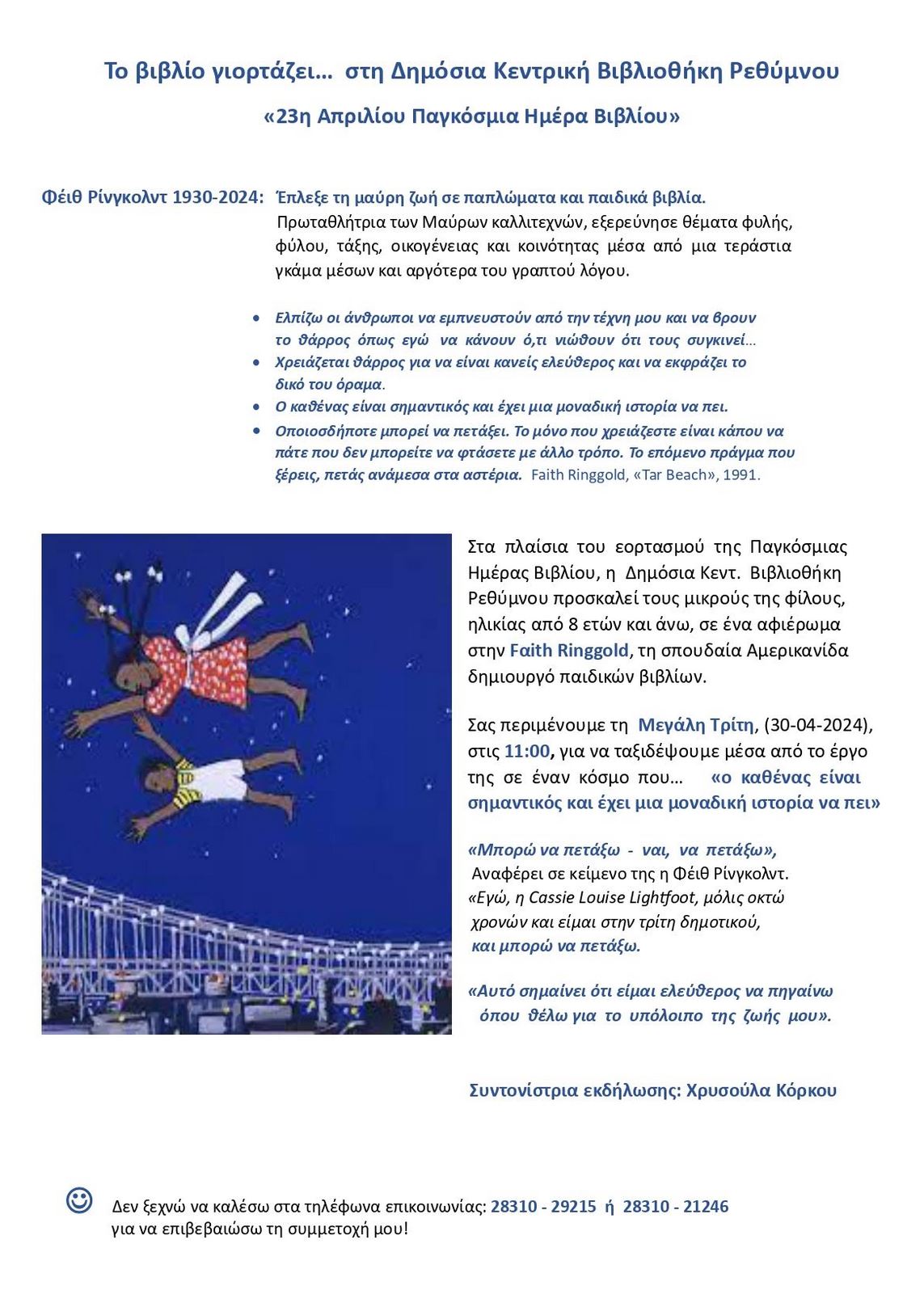 Στα πλαίσια του εορτασμού της Παγκόσμιας Ημέρας Βιβλίου, η Δημόσια Κεντ. Βιβλιοθήκη Ρεθύμνου προσκαλεί τους μικρούς της φίλους, ηλικίας από 8 ετών και άνω, σε ένα αφιέρωμα στην Fαith Ringgold, τη σπουδαία Αμερικανίδα δημιουργό παιδικών βιβλίων.