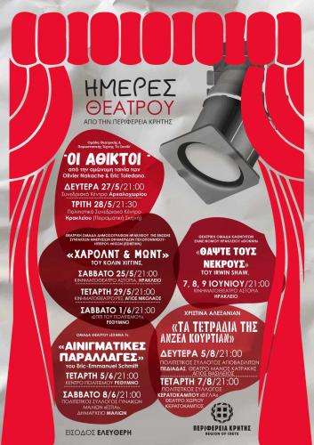Το επόμενο χρονικό διάστημα θα ανακοινωθούν οι θεατρικές παραστάσεις που θα διοργανωθούν στα πλαίσια των Ημερών Θεάτρου από την Περιφέρεια Κρήτης σε συνεργασία με άλλες θεατρικές ομάδες, τοπικούς φορείς και πολιτιστικούς συλλόγους.