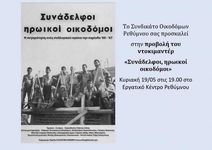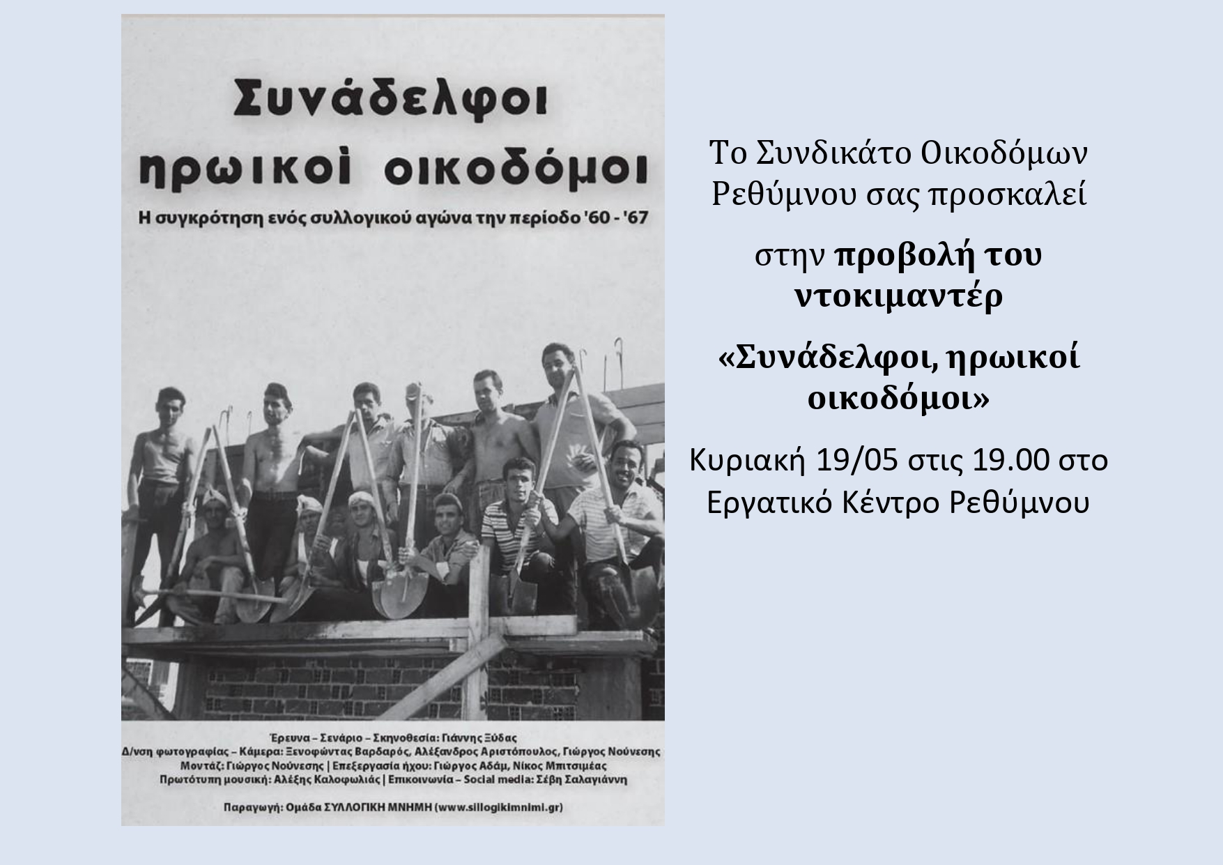 Το Συνδικάτο Οικοδόμων Ρεθύμνου σας προσκαλεί στην προβολή του ντοκιμαντέρ της Ομάδας «Συλλογική Μνήμη», με τίτλο «Συνάδελφοι Ηρωικοί Οικοδόμοι» την Κυριακή 19/05 στις 19.00 στο Εργατικό Κέντρο Ρεθύμνου. Η είσοδος θα είναι ελεύθερη.