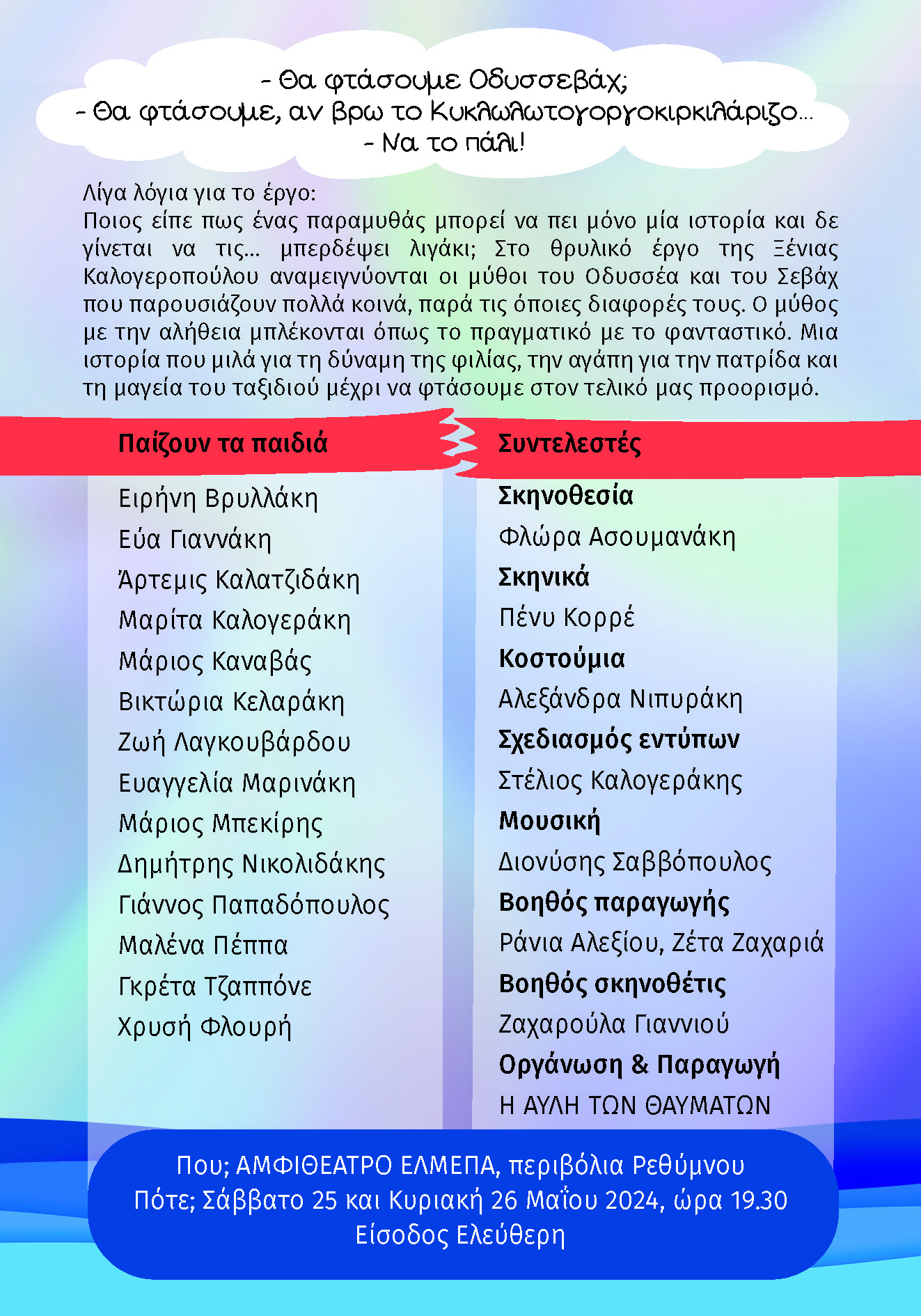 Στο θρυλικό έργο της Ξένιας Καλογεροπούλου αναμειγνύονται οι μύθοι του Οδυσσέα και του Σεβάχ που παρουσιάζουν πολλά κοινά, παρά τις όποιες διαφορές τους. Ομύθος με την αλήθεια μπλέκεται όπως το πραγματικό με το φανταστικό. Μια ιστορία που μιλά για τη δύναμη της φιλίας, την αγάπη για την πατρίδα και τη μαγεία του ταξιδιού μέχρι να φτάσουμε στον τελικό μας προορισμό.