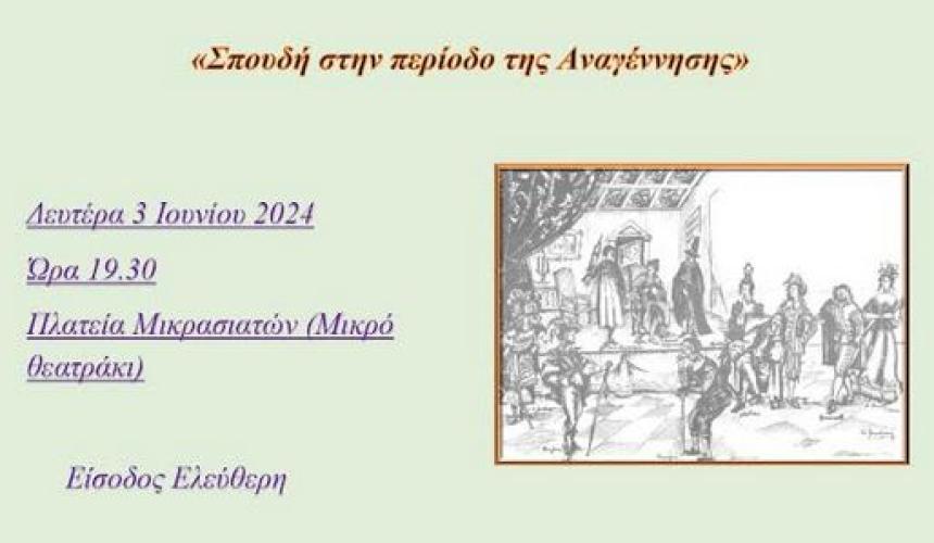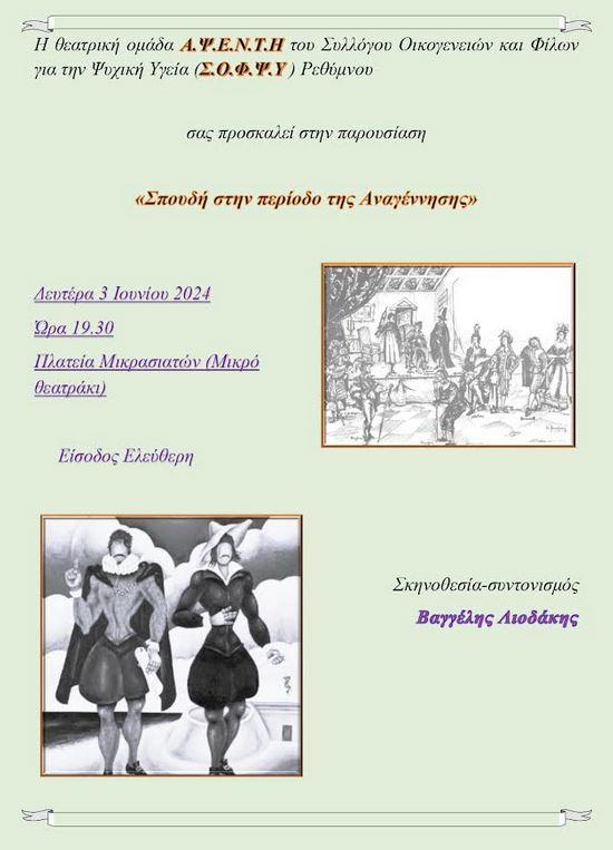 Η Θεατρική ομάδα Α.Ψ.Ε.Ν.Τ.Η. του Συλλόγου Οικογενειών και φίλων Ψυχικής Υγείας (Σ.Ο.Φ.Ψ.Υ.) Ν. Ρεθύμνου, κλείνοντας τον φετινό κύκλο συναντήσεών της παρουσιάζει θεατρικά κείμενα και ποιήματα με θέμα «Σπουδή στην περίοδο της Αναγέννησης», με συντονιστή/σκηνοθέτη τον Βαγγέλη Λιοδάκη, τη Δευτέρα 3 Ιουνίου 2024 και ώρα 19.30 μ.μ, στην Πλατεία Μικρασιατών (Μικρό θεατράκι) με ελεύθερη είσοδο.