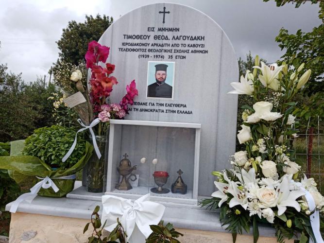 Mε μια σεμνή τελετή, και μέσα σε κλίμα ιδιαίτερης συγκίνησης, πραγματοποιήθηκε το Σάββατο 25 Μαΐου 2024 στο Καβούσι Ρεθύμνης εκδήλωση μνήμης κα τιμής αφιερωμένη στο μακαριστό Ιεροδιάκονο Αρκαδίτη π. ΤΙΜΟΘΕΟ ΛΑΓΟΥΔΑΚΗ για τα 50 χρόνια από το θάνατό του (1974-2024).