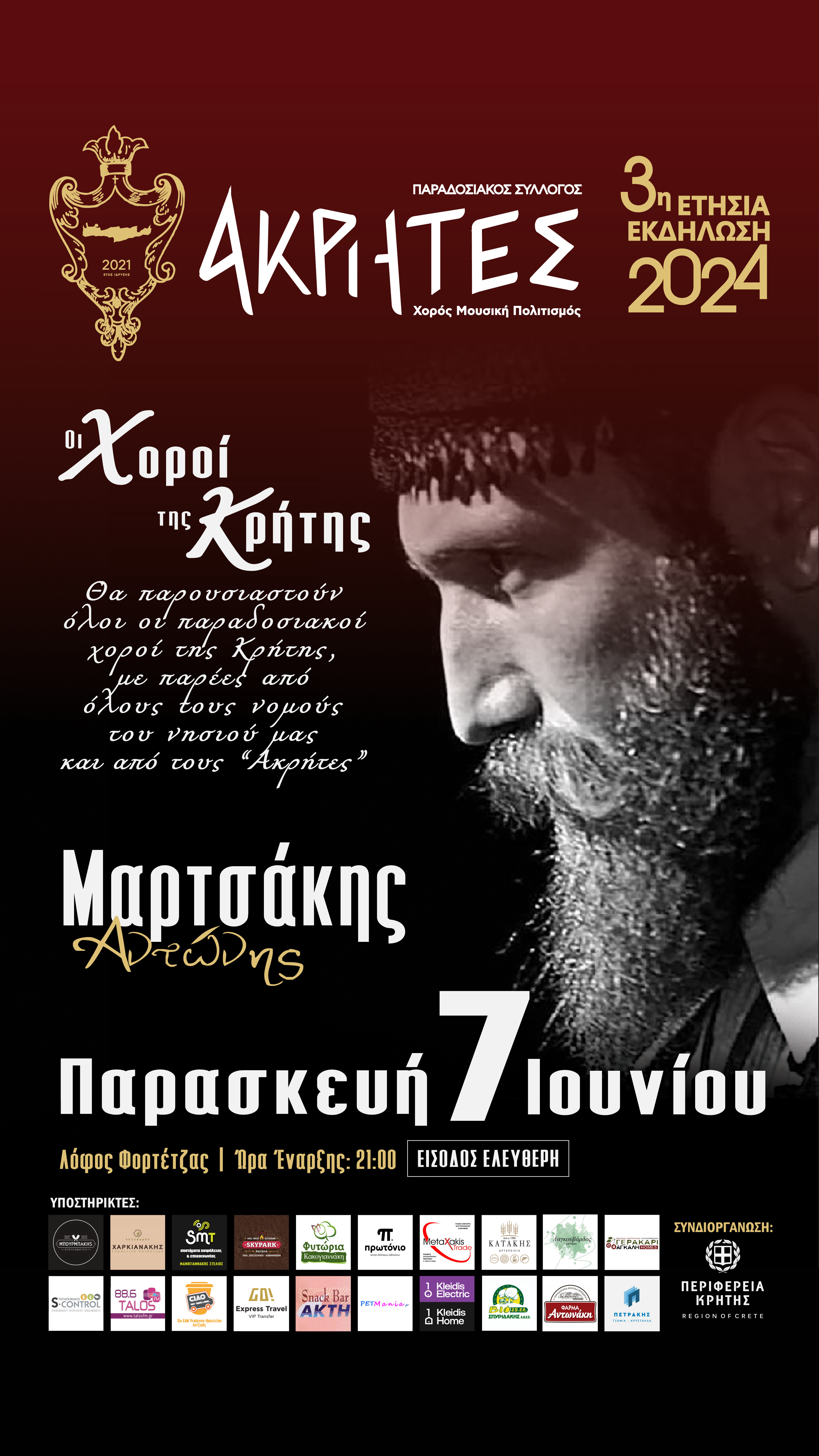 Η 3η Ετήσια Εκδήλωσή του Παραδοσιακού Συλλόγου "ΑΚΡΗΤΕΣ" θα γίνει την Παρασκευή 7Ιουνίου 2024 και ώρα έναρξης 9:00μ.μ στο Λόφο της Φορτέτζας με είσοδο ελεύθερη για όλο τον κόσμο.