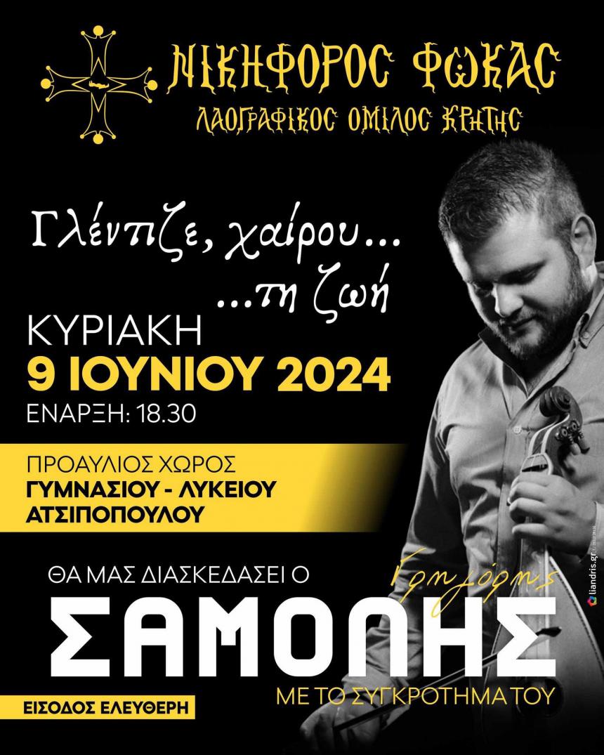 Ο Λαογραφικός Όμιλος Κρήτης " Νικηφόρος Φωκάς " σας προσκαλεί την Κυριακή 9 Ιουνίου στο παραδοσιακό γλέντι που διοργανώνει για τη λήξη της φετινής μουσικοχορευτικής χρονιάς.