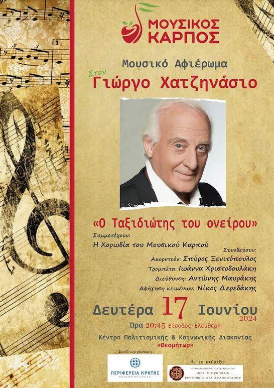 Εκδήλωση από το Μουσικό Καρπό "Αφιέρωμα στον Γιώργο Χατζηνάσιο" σε συνεργασία με την Περιφερειακή Ενότητα Ρεθύμνης και με τη στήριξη της Μητρόπολης Ρεθύμνης και Αυλοποτάμου.