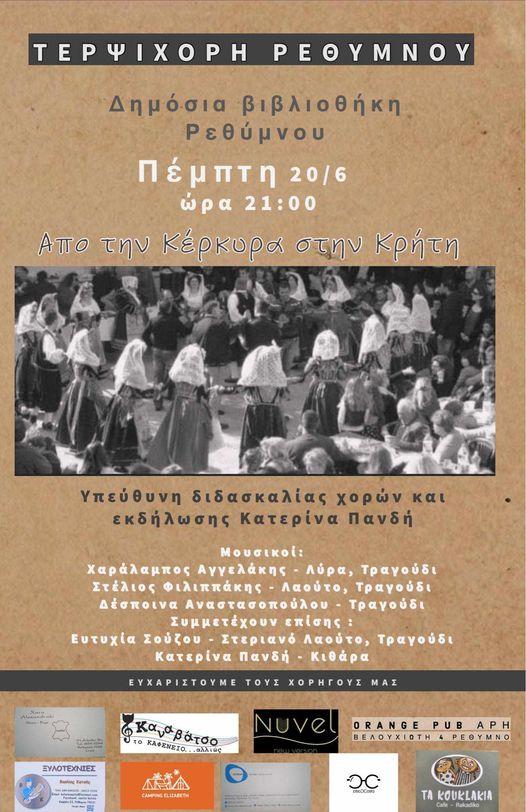 Την Πέμπτη 20-06-2024 και ώρα 21:00 στην ταράτσα της πανέμορφης Δημόσιας Βιβλιοθήκης του Ρεθύμνου, η Χορευτική ομάδα «Τερψιχόρη Ρεθύμνου» θα επιχειρήσει ένα μουσικοχορευτικό ταξίδι στην παράδοση των Επτανήσων.