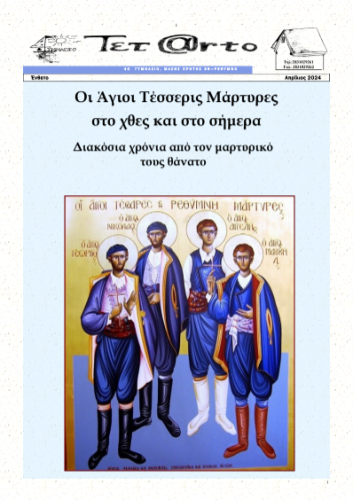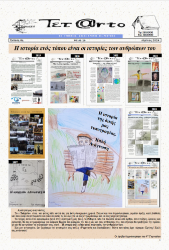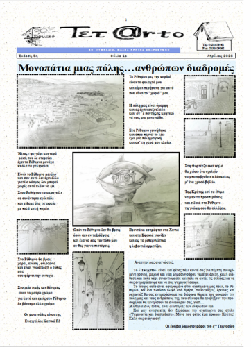 Το Ρέθυμνο υποδέχεται με ενθουσιασμό για μία ακόμη φορά την έκδοση της μαθητικής εφημερίδας «Tet@rto» από το 4ο Γυμνάσιο Ρεθύμνου, η οποία αναδεικνύει την πλούσια ιστορία και τον πολιτισμό της πόλης μας. Οι μαθητές μαζί με τη διευθύντρια του σχολείου και υπεύθυνη του προγράμματος, Συκιώτη Φλωρέττα και τις συντονίστριες φιλολόγους, Καραντζίκου Ελένη και Βασάκη Μαρία-Ελένη, έχουν δημιουργήσει ένα εκπληκτικό έντυπο που -εκτός από τις δράσεις του σχολείου- περιλαμβάνει πλήθος από άρθρα, συνεντεύξεις και μαρτυρίες για σημαντικά ιστορικά γεγονότα, μνημεία και πρόσωπα του Ρεθύμνου.