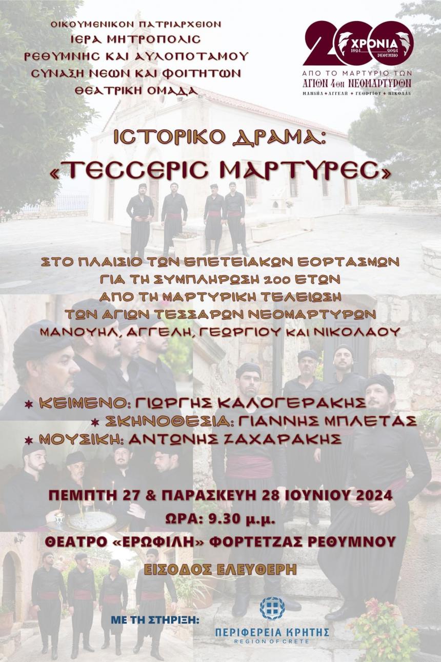 H Θεατρική Ομάδα Μητροπόλεως, στα πλαίσια των εκδηλώσεων για τα 200 χρόνια από την εθελοθυσία των Τεσσάρων Μαρτύρων παρουσιάζει το έργο «Τέσσερις Μάρτυρες», το οποίο πραγματεύεται τη ζωή και το μαρτύριο των πολιούχων Νεομαρτύρων του Ρεθύμνου.