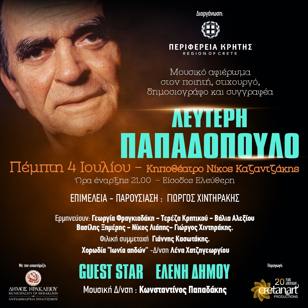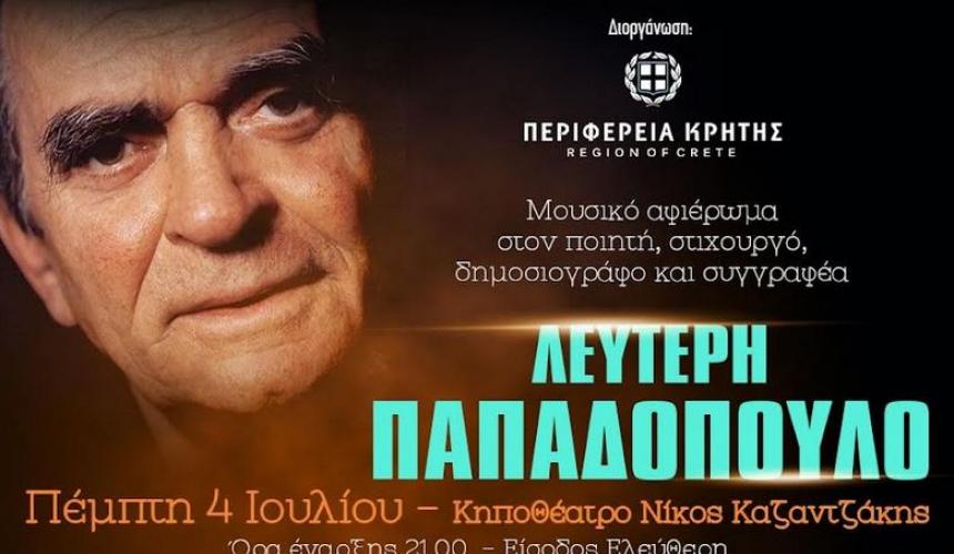 Ο Γιώργος Χιντηράκης επιμελείται και παρουσιάζει ένα μουσικό αφιέρωμα στον κορυφαίο ποιητή, στιχουργό, δημοσιογράφο και συγγραφέα Λευτέρη Παπαδόπουλο, με τη συμμετοχή της Ελένης Δήμου, σε μια συναυλία που γίνεται με την διοργάνωση της Περιφέρειας Κρήτης.