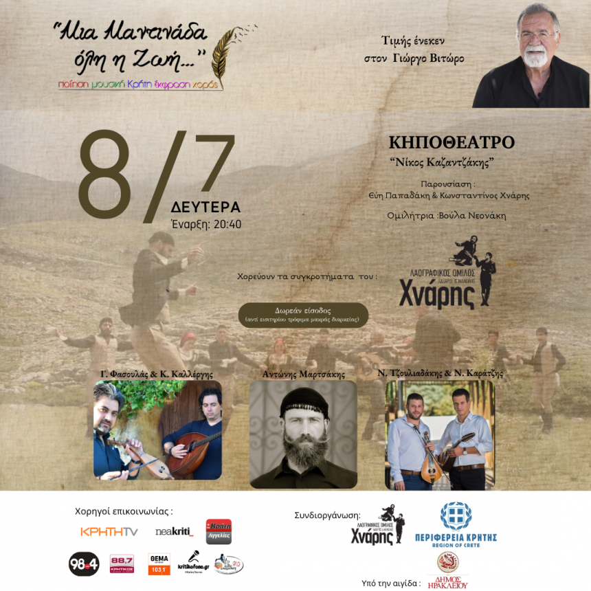 Ο λαογραφικός όμιλος Λάζαρος και Μανόλης Χνάρης, σας προσκαλεί, σε μία εκδήλωση -αφιέρωμα στην Κρητική μαντινάδα !