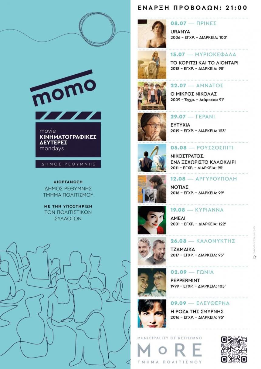 Ξεκινά την Δευτέρα 8 Ιουλίου 2024 ο νέος πολιτιστικός θεσμός του Δήμου Ρεθύμνης με θεματικό τίτλο «Κινηματογραφικές Δευτέρες». Πρόκειται για κινηματογραφικές προβολές, με ελεύθερη είσοδο, σε πλατείες και άλλους υπαίθριους χώρους οικισμών του Δήμου Ρεθύμνης που θα πραγματοποιηθούν με την υποστήριξη των πολιτιστικών συλλόγων των χωριών που μεταξύ άλλων υπόσχονται να μεταφέρουν στους επισκέπτες την ξεχωριστή και αγαπημένη ατμόσφαιρα του Θερινού Κινηματογράφου.